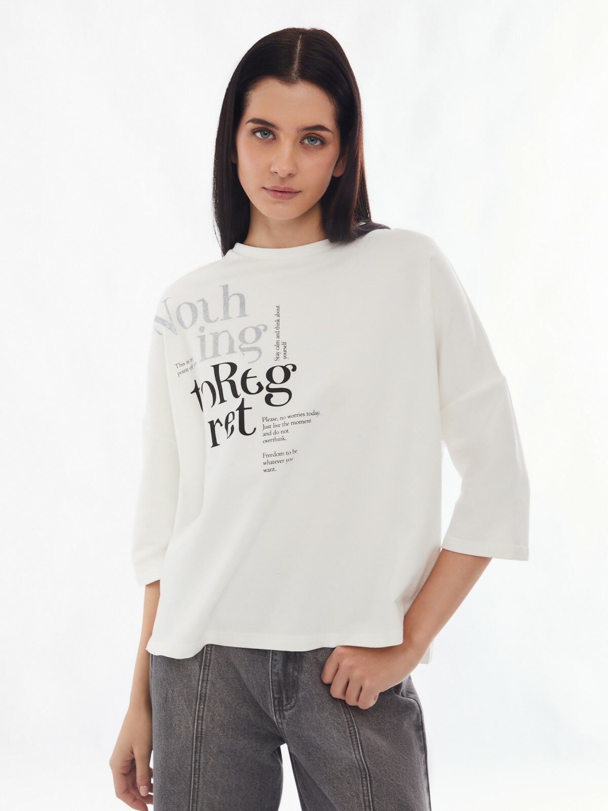 10 цен на Тонкий джемпер-футболка оверсайз с надписью, цвет Молоко, размер XL 02413319Y091