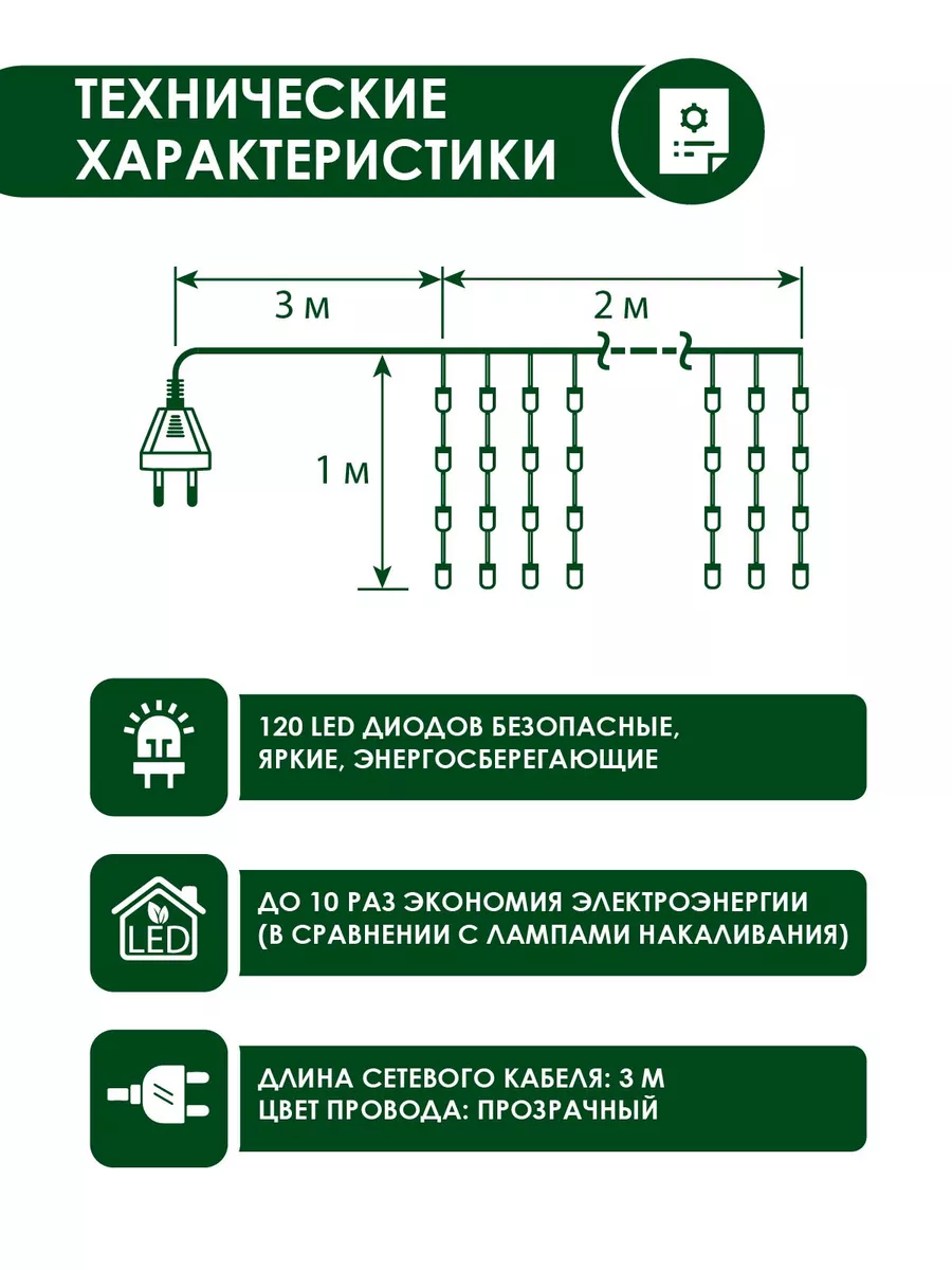 Электрогирлянда Световой занавес, 2 м х 1 м, 120 тёплых белых матовых светодиодов, для использования внутри помещений