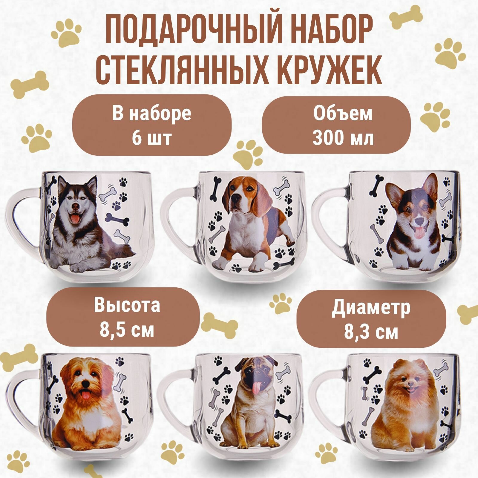 Набор из 6 стеклянных кружек. 300мл. Собачки информация: