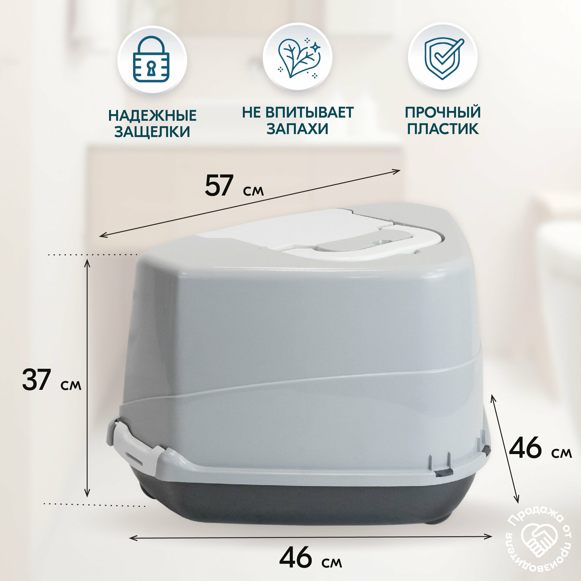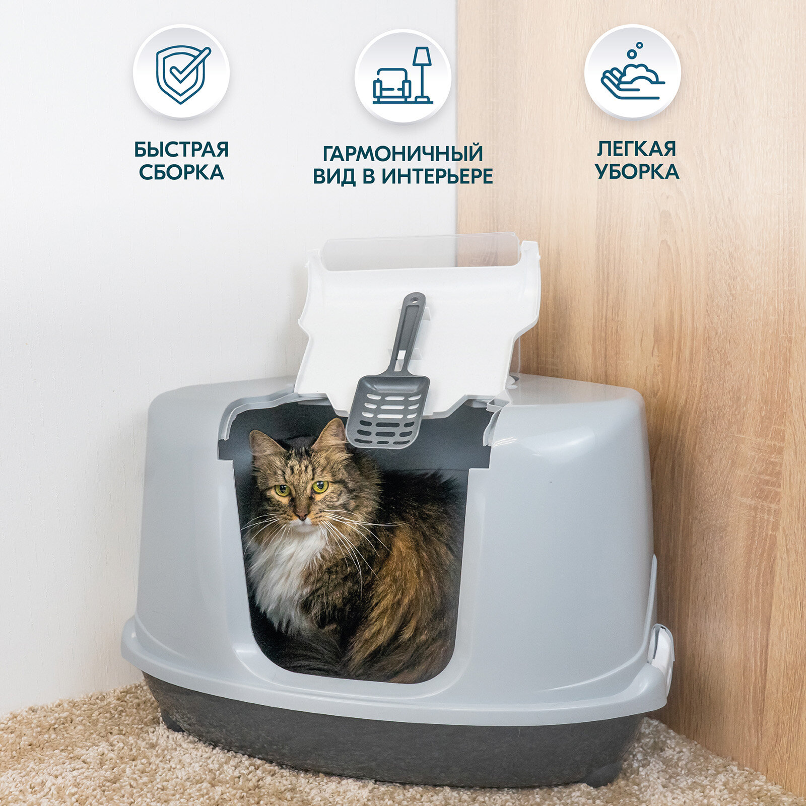 10 цен на Туалет для кошек угловой, лоток закрытый и совок "PetTails" домик с дверцей 57 х 46 х 37 см, темно-серый низ/светло-серый верх