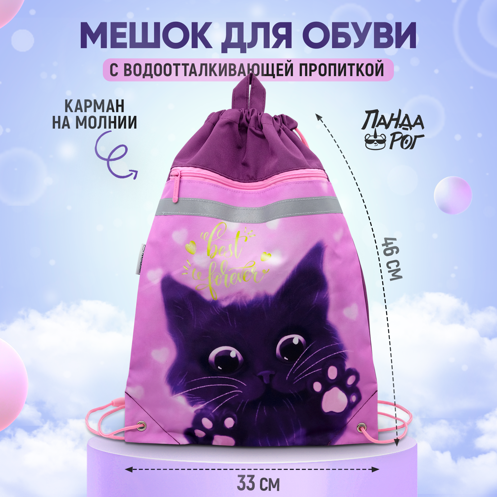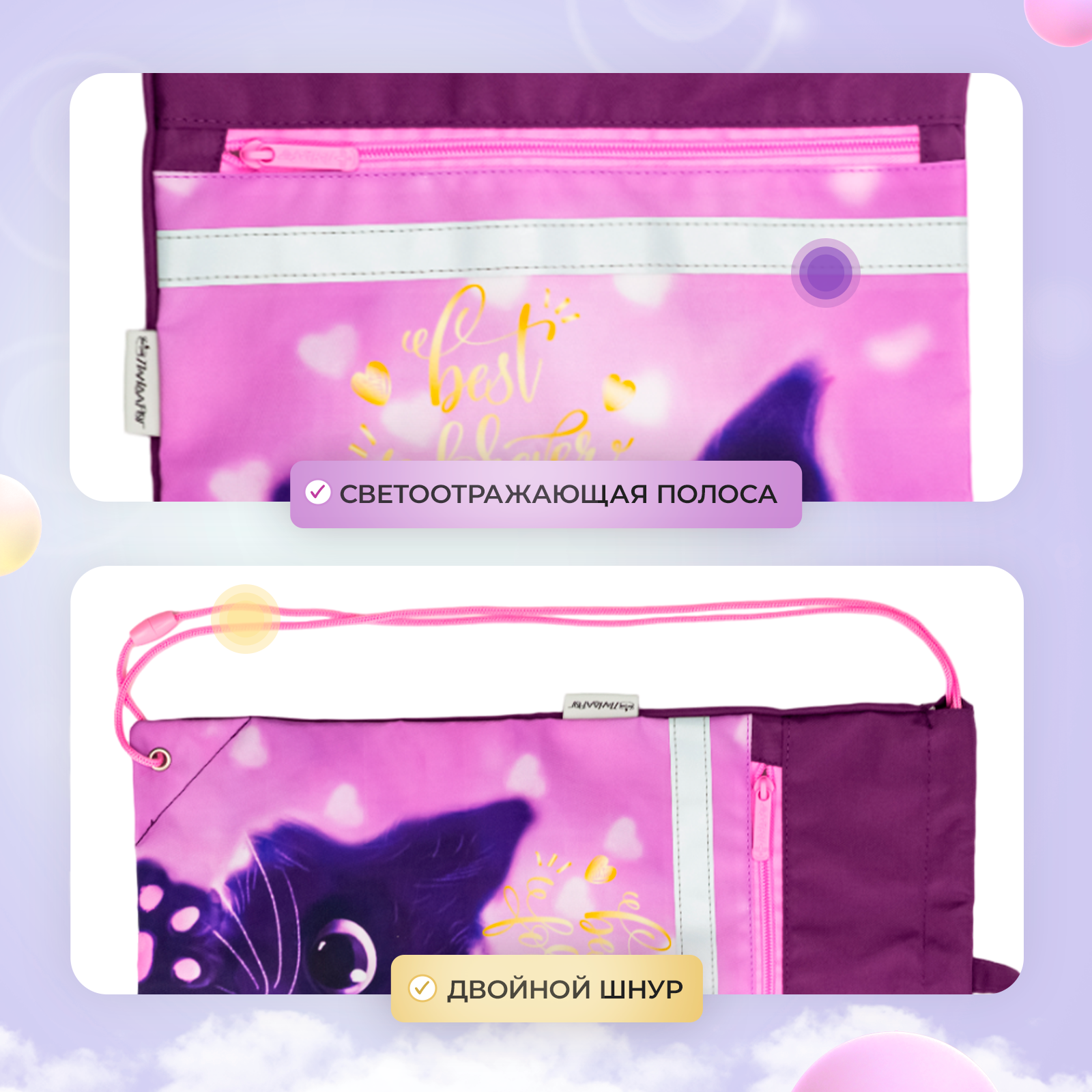 Отзывы на Сумка / мешок / рюкзак для сменной обуви (сменки), карман на молнии, с ручкой с петлей для подвеса 46х33 см, 2 отделения, Сиреневый кот