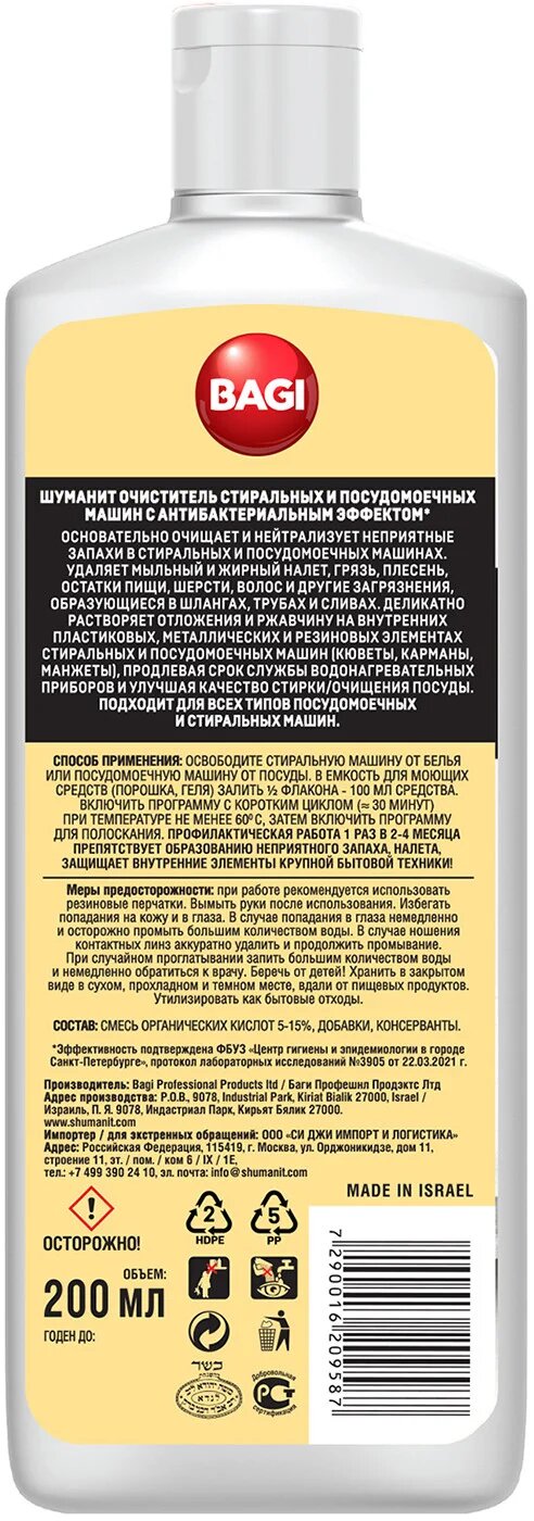 Bagi Шуманит очиститель стиральных и посудомоечных машин с антибактериальным эффектом 200 мл информация: