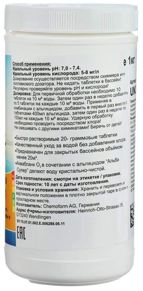 | Дополнительная информация | таблетки 20 г; средство рекомендовано в закрытых бассейнах |