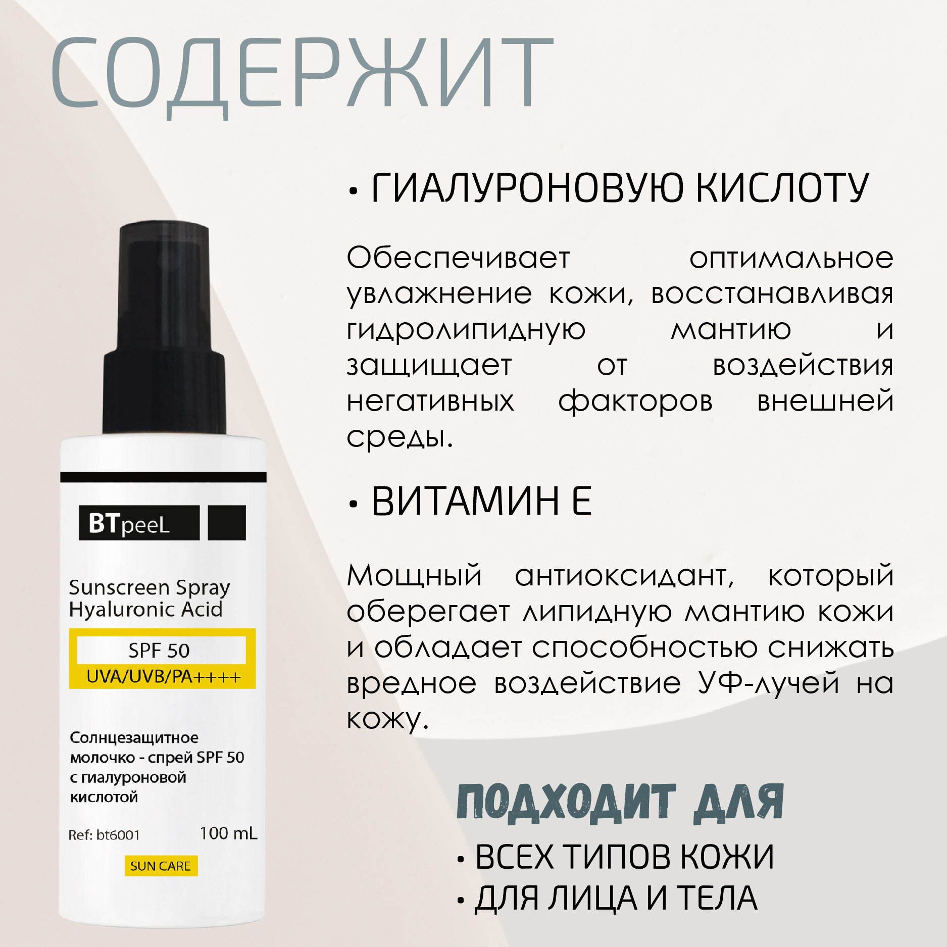 Солнцезащитное молочко-cпрей SPF-50 UVA/UVB/PA++++ с гиалуроновой кислотой BTpeel, 100 мл информация: