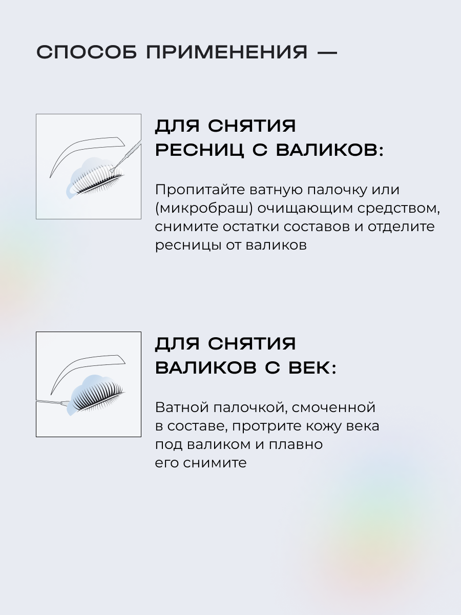 | Дополнительная информация | С помощью ватной палочки или микробраша, пропитанного средством, снимите остатки краски и отделите ресницы от валиков. Проглаживайте ресницы, двигаясь по направлению от корней к кончикам, пока они не отклеятся. При помощи средства EYELASH CLEANSER удалите силиконовые валики с век. Ватной палочкой, смоченной в составе, протрите кожу века под валиком и плавно его снимите. |