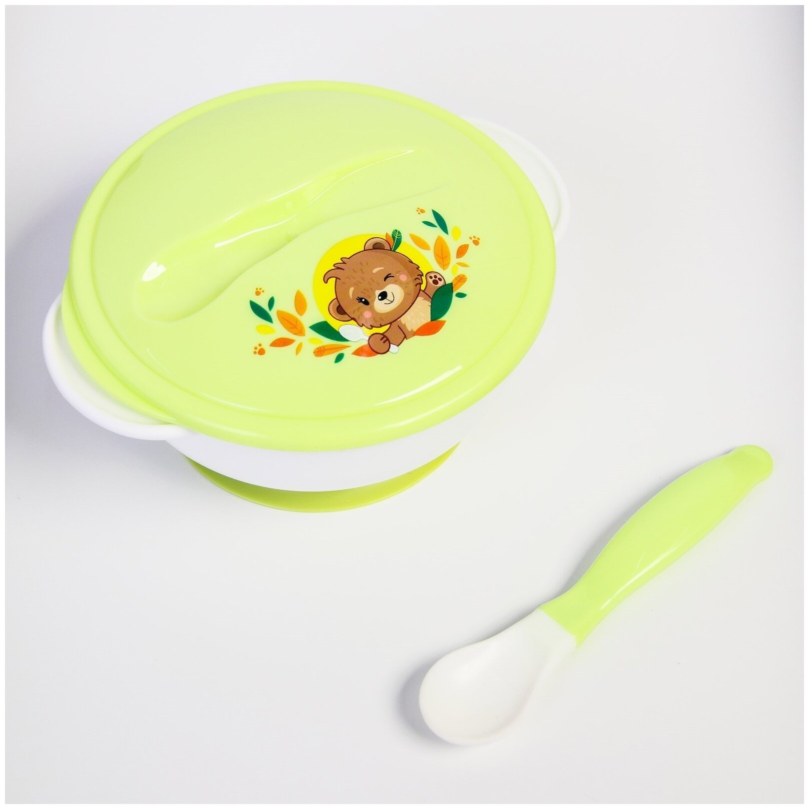 Набор детской посуды Друзья, 3 предмета: тарелка на присоске, крышка, ложка, цвет зелёный