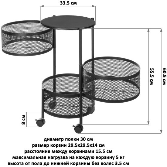 | Дополнительная информация | Этажерка 3-х ярусная на колесиках "Черная" 33,5х32х60,5 см, размер этажерки без колесиков 33,5х32х55,5 см, на 4-х колесиках, 2 колесика с фиксаторами, диаметр полки 30 см, размер корзин 29,5х29,5х14 см, расстояние между корзинами 15,5 см, высота от пола до нижней корзины без колес - 3,5 см, с колесами - 8 см, максимальная нагрузка на каждую корзину 5 кг, металлическая |