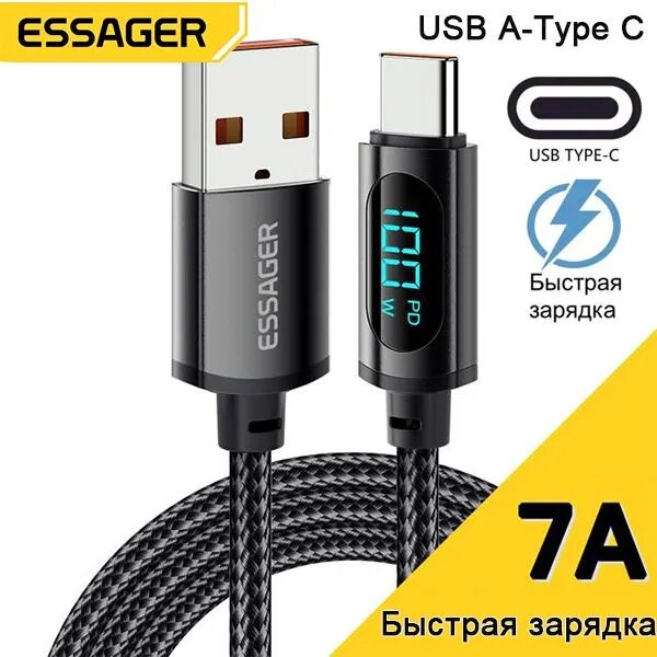 10 цен на Кабель для быстрой зарядки и передачи данных Essager с измерителем силы тока (E-mark чип) USB-Type-C, макс 100 Вт, 7 А, 480 Мбит/с, 2 м (Черный)