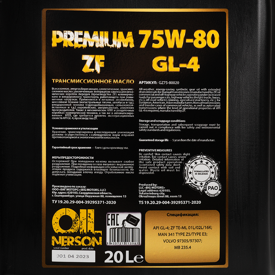 Масло трансмиссионное NERSON OIL Premium ZF GL-4 75W-80 PAO синтетическое 20л информация: