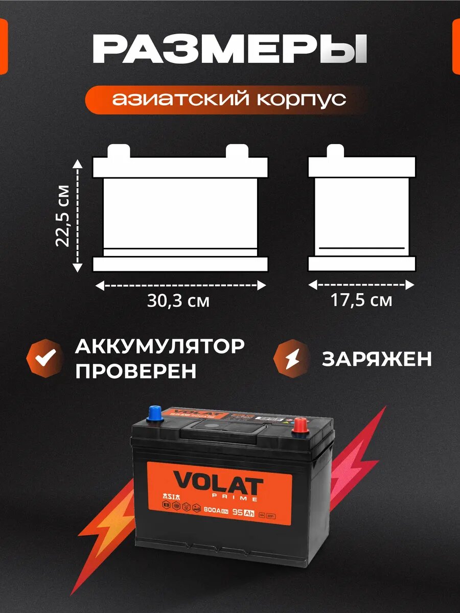 Аккумулятор автомобильный VOLAT Prime Asia (нижний борт) 95 Ah 800 A обратная полярность 303x175x225 информация: