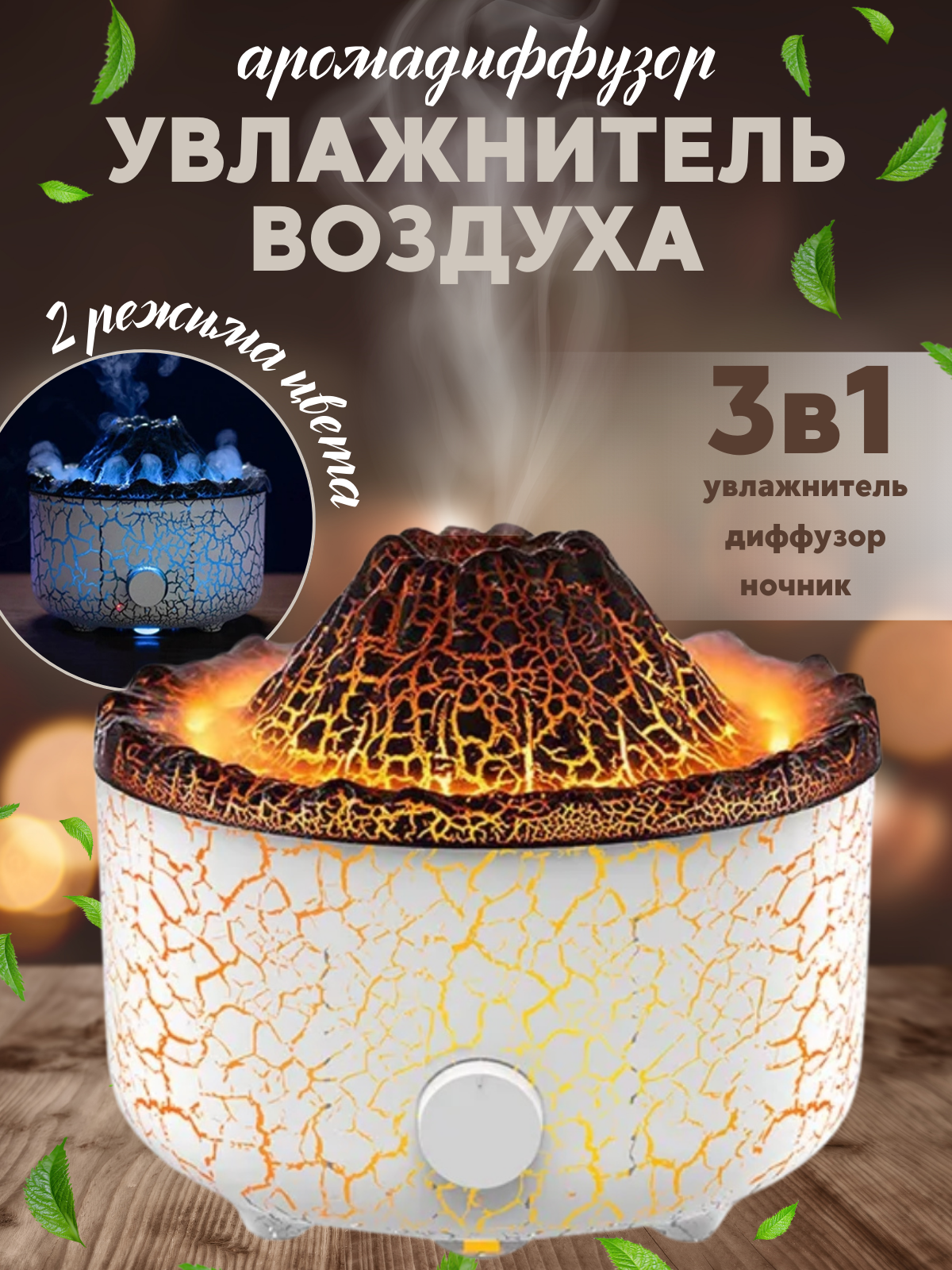 Увлажнитель воздуха для дома Вулкан. Настольный и напольный, ультразвуковой, портативный с подсветкой, аромадиффузор, ночник. информация: