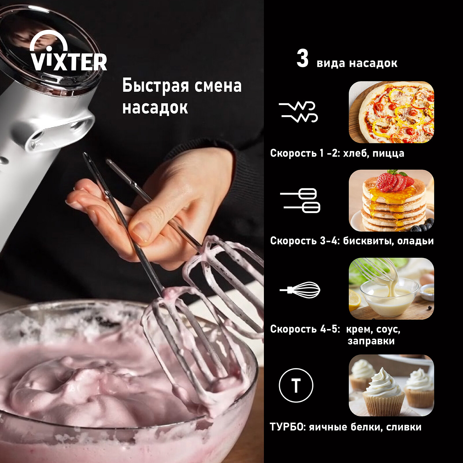 Ручной миксер VIXTER VHM-3300 с пятью скоростями и насадками для взбивания, замешивания и хранения информация: