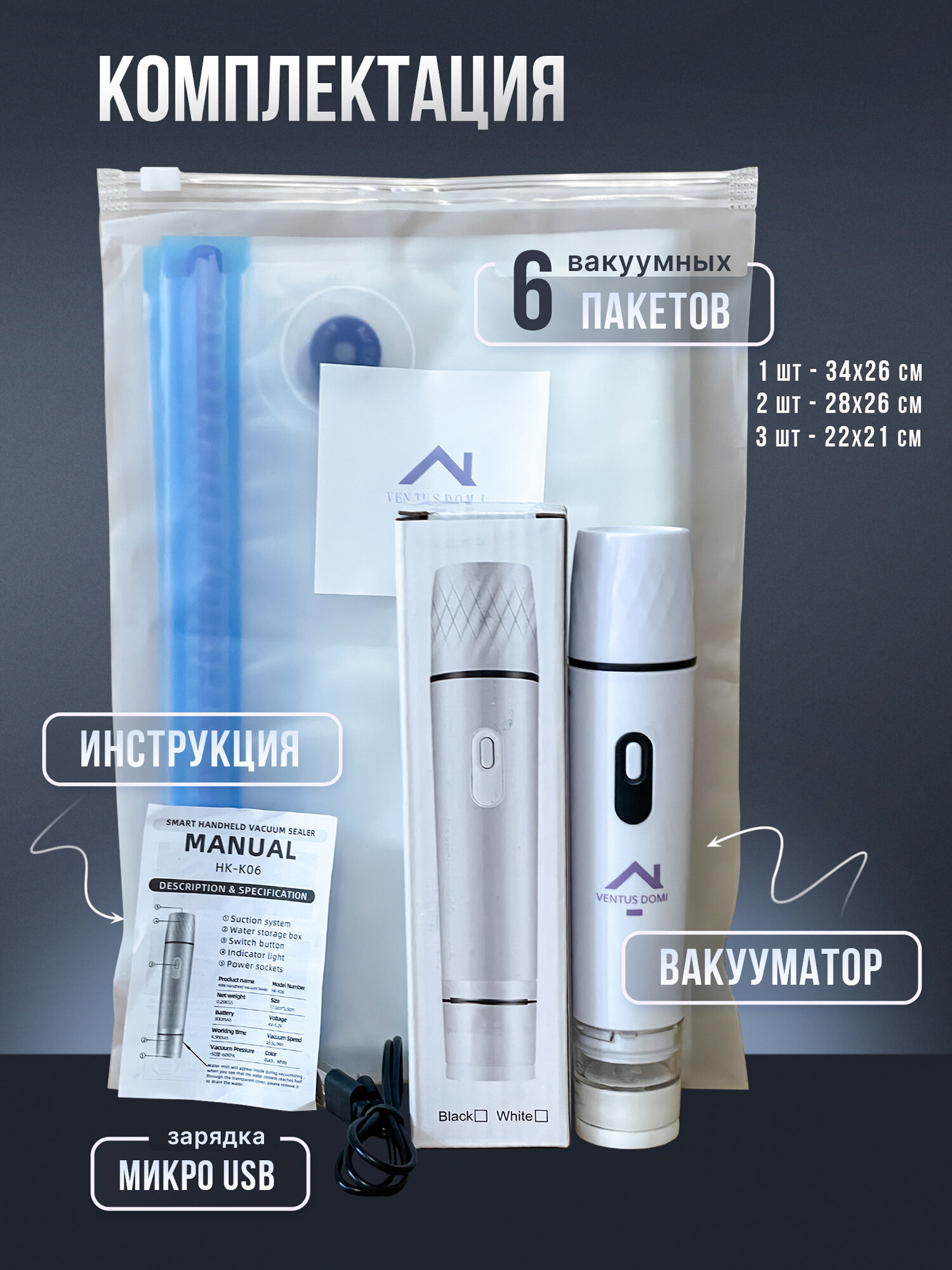 | Подробная комплектация | Портативный вакуумный упаковщик, 6 вакуумных пакетов, инструкция, зарядный кабель |