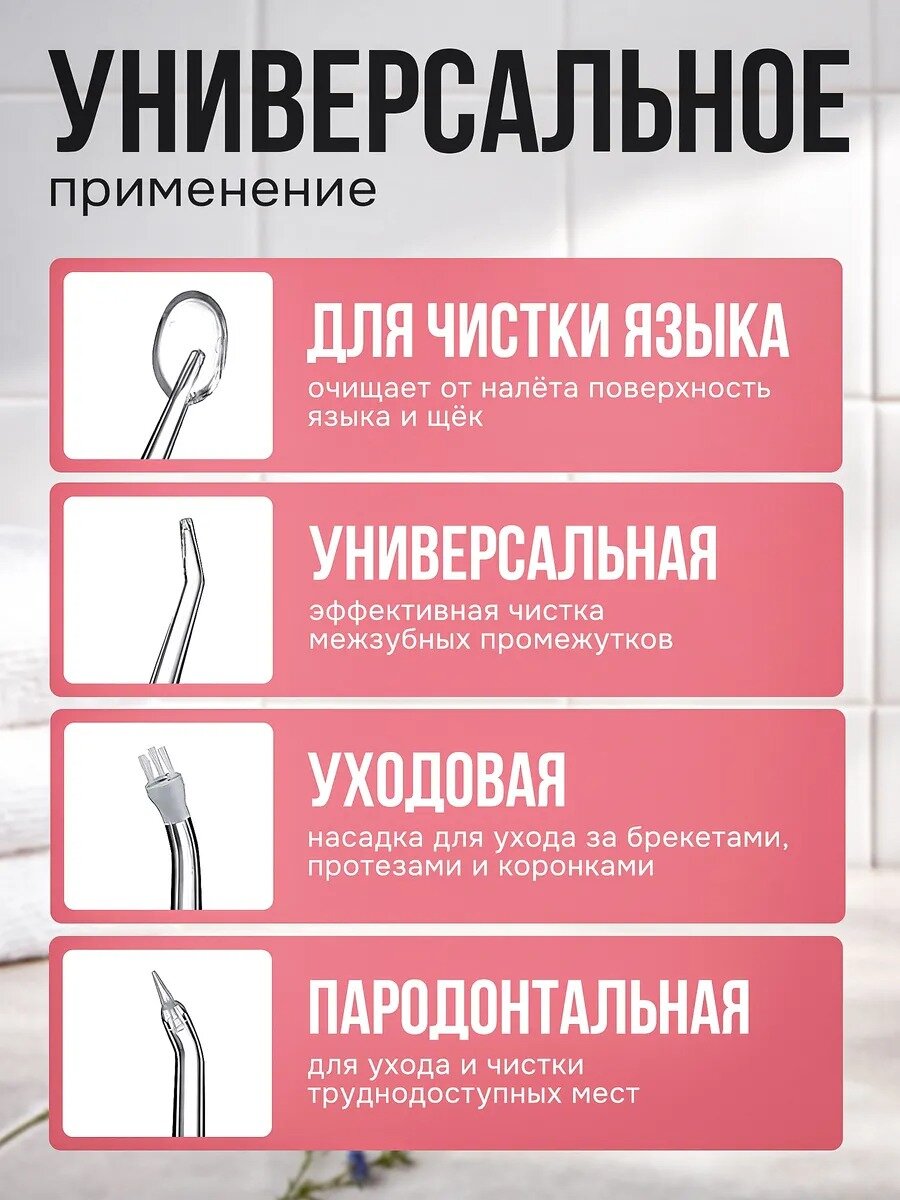 | Насадки | для струйной чистки / для чистки имплантов и коронок / для чистки языка / ортодонтическая (для брекетов) |