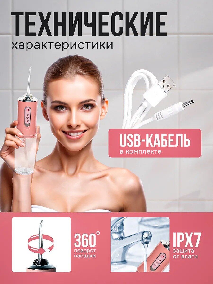 10 цен на Ирригатор для чистки полости рта и зубов портативный с комплектом насадок и зврядным кабелем USB. розовый