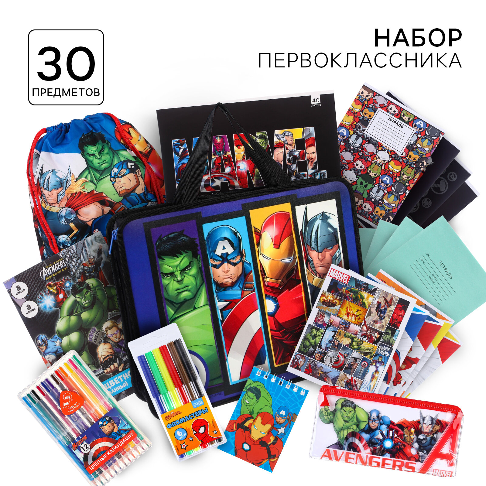 Набор первоклассника в папке, Мстители, 30 предметов информация: