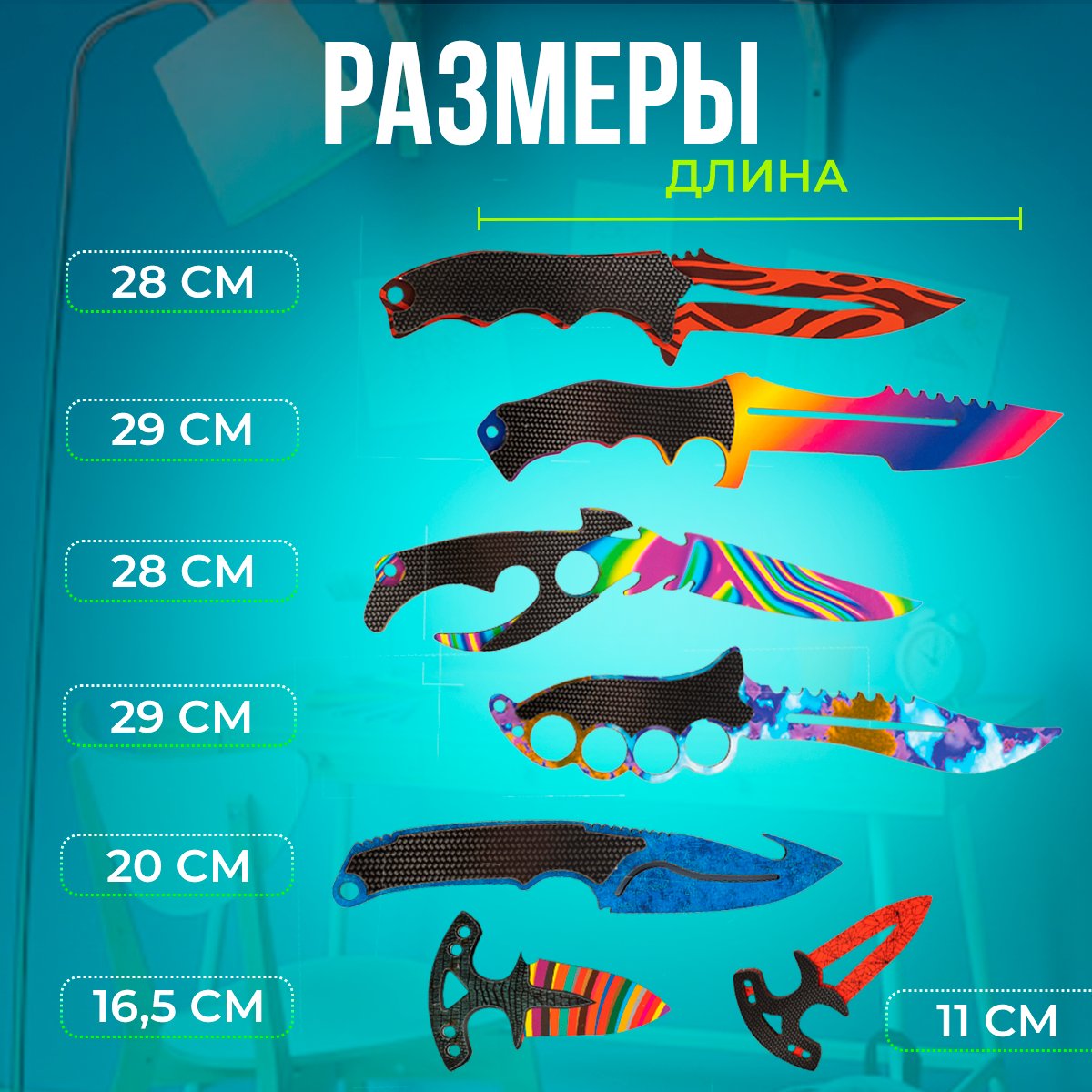 | Комплектация | Количество предметов в упаковке 7 шт. Комплектация кастетный нож-1 шт, охотничий нож большой и малый- 2 шт, нож акула-1 шт , тычковый нож большой и малый-2 шт. |