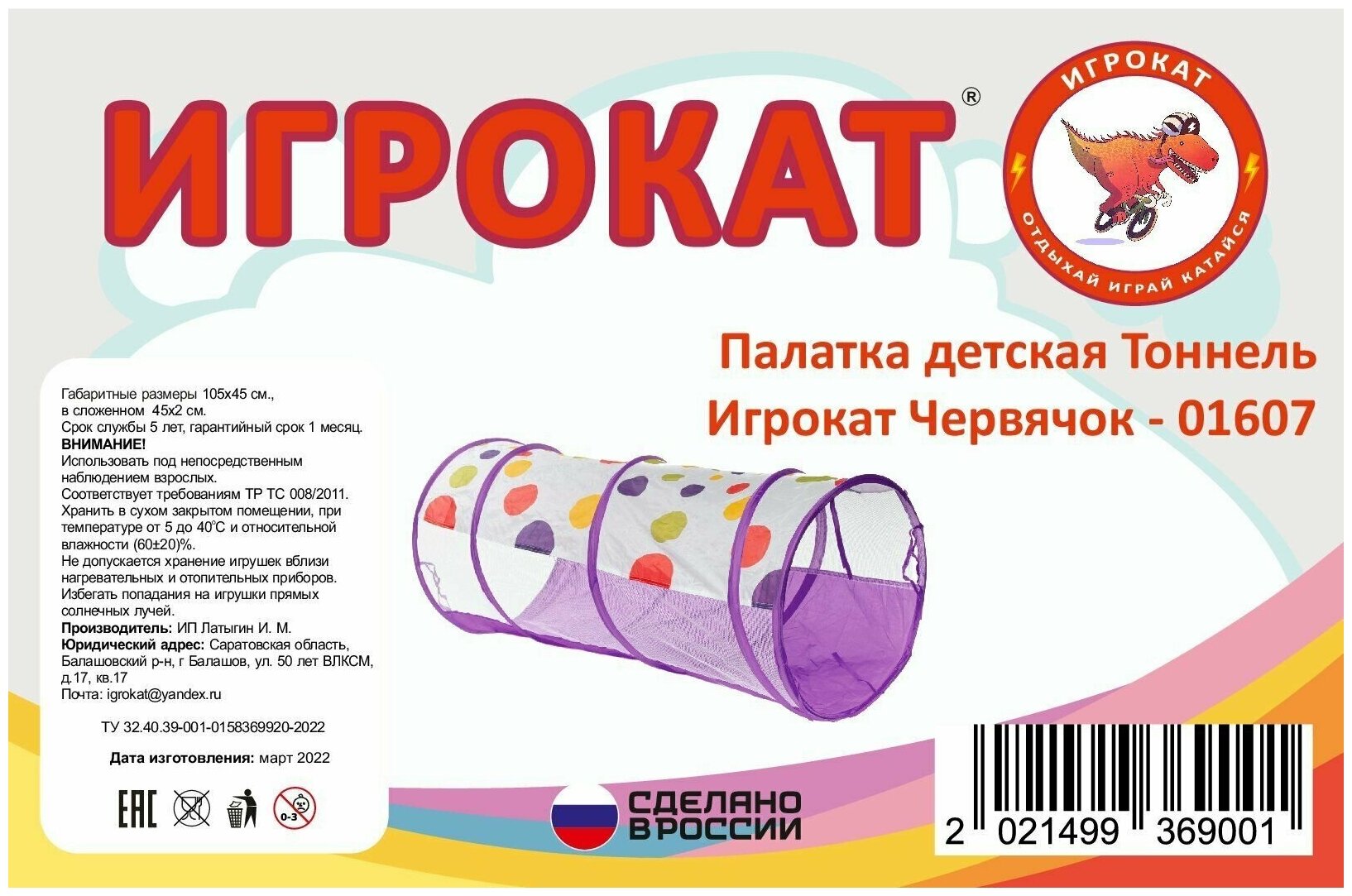 Палатка детская Тоннель Игрокат Червячок бело-фиолетовый, вигвам детский информация: