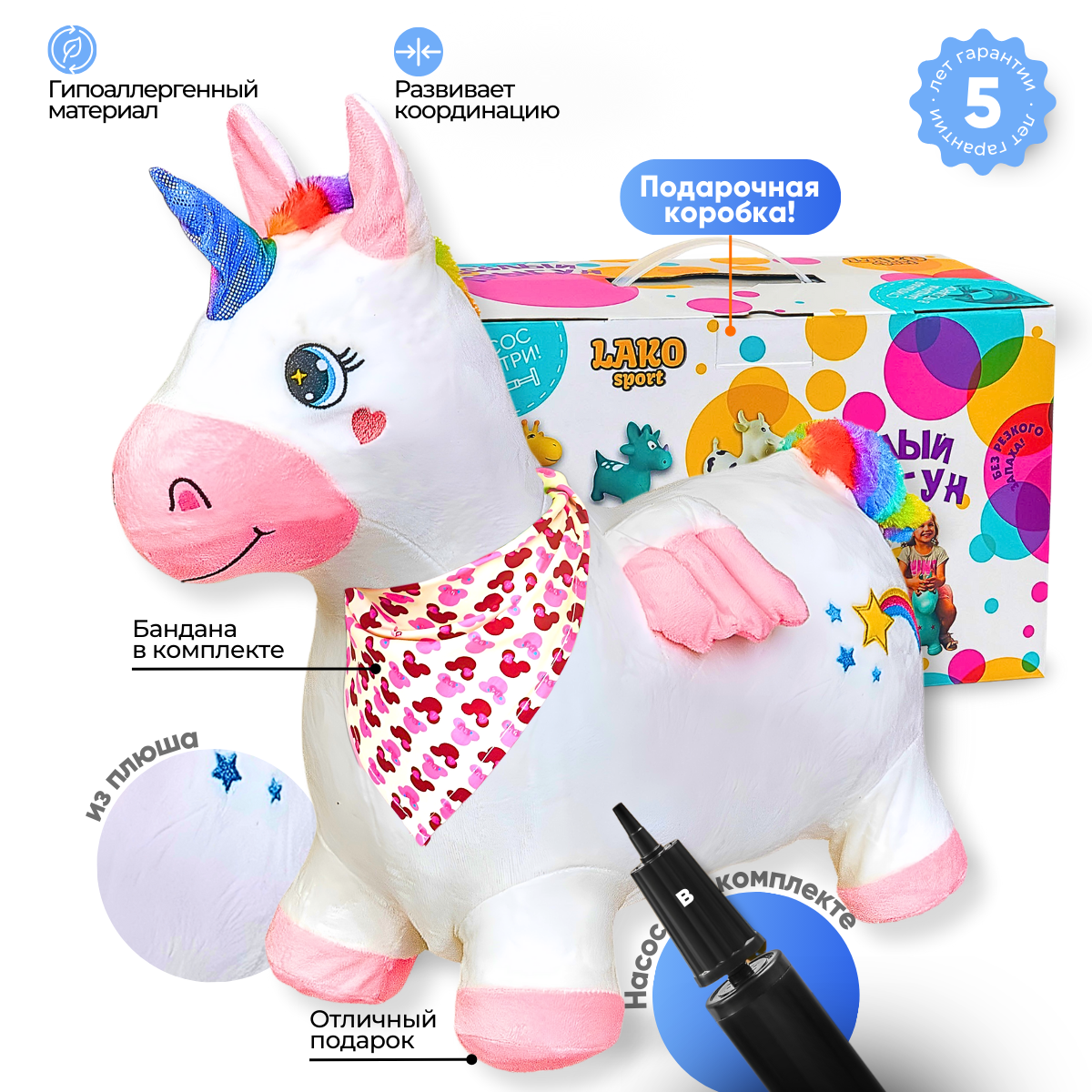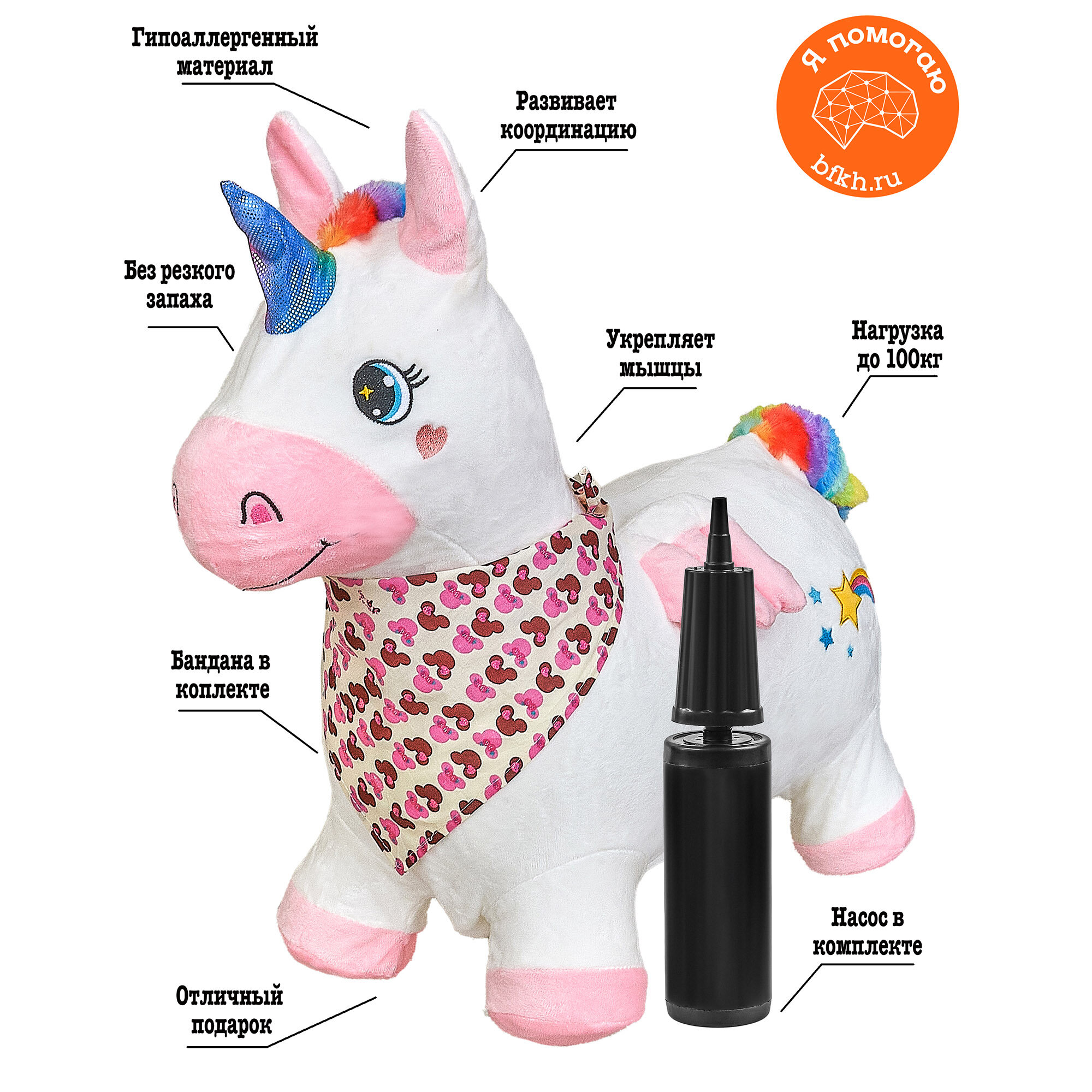 Отзывы на Прыгун Плюшевый Единорог, детская надувная развивающая игрушка-тренажер в чехле (в комплекте с насосом и платком-банданой)