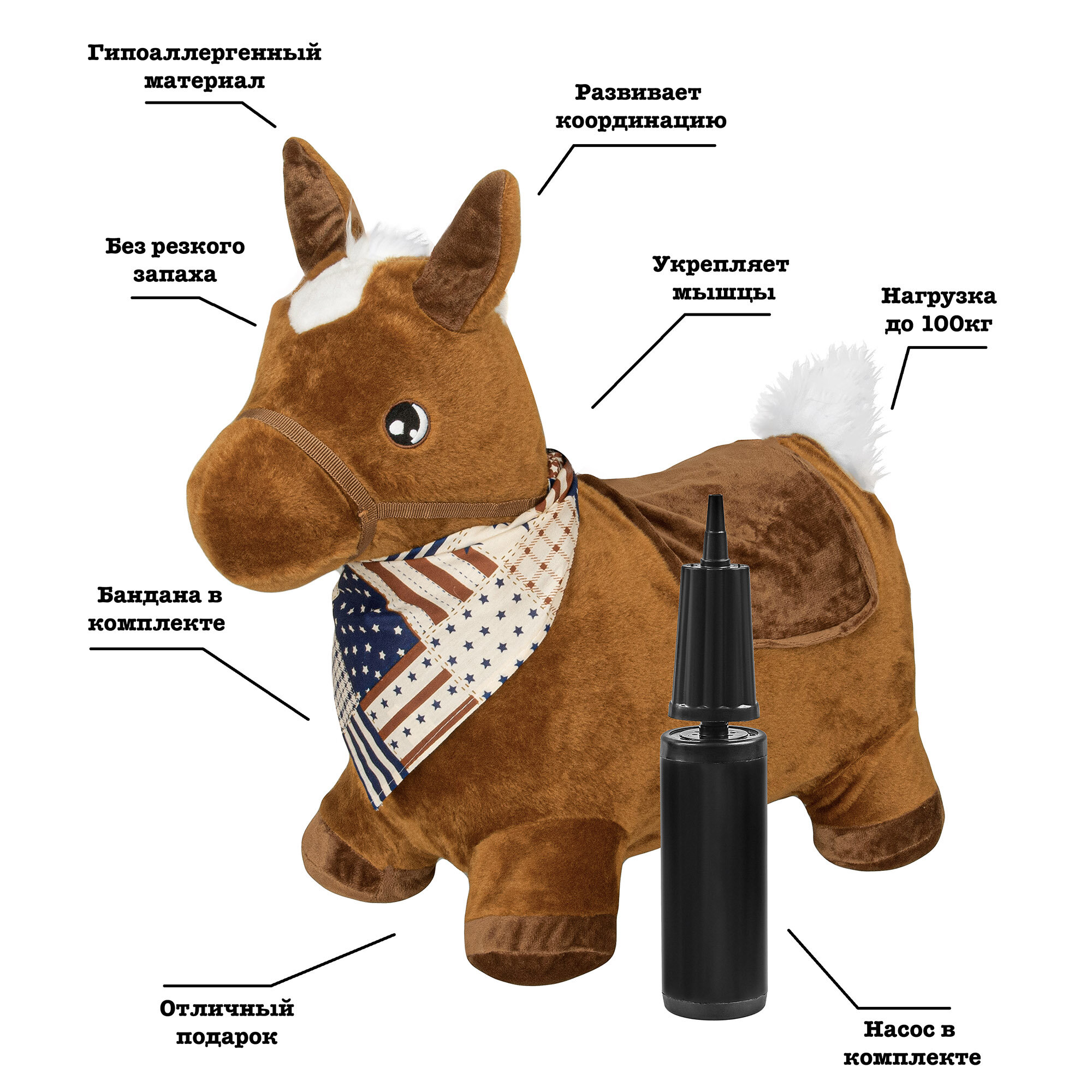 Прыгун Плюшевая Лошадка, детская надувная развивающая игрушка-тренажер в чехле (в комплекте с насосом и платком-банданой) информация: