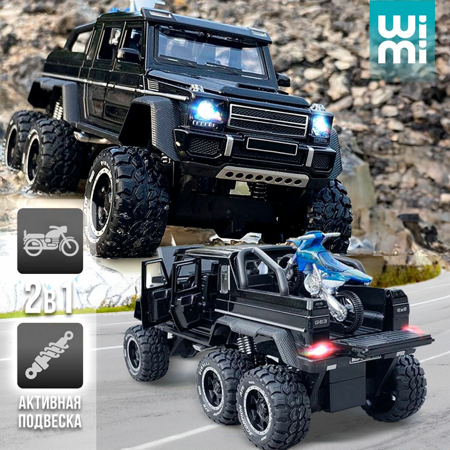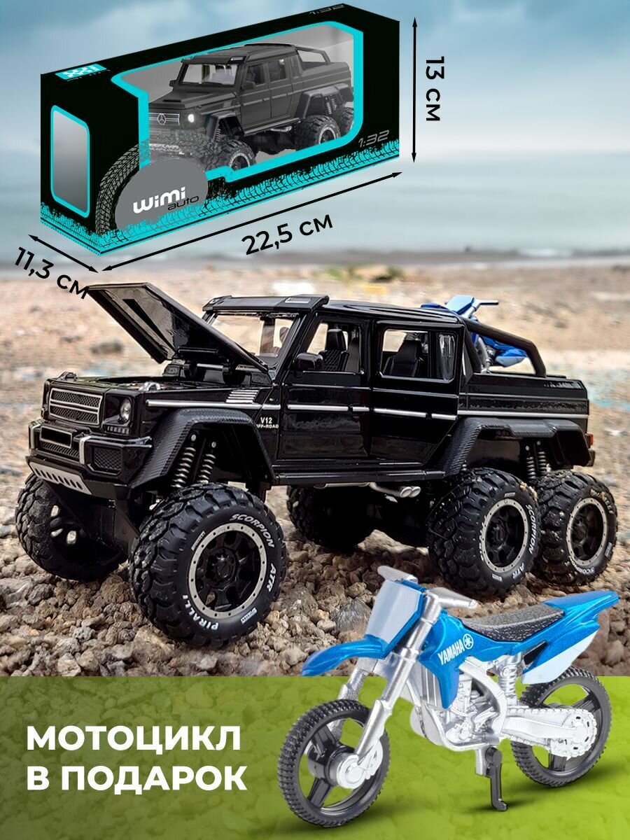 Машинка металлическая WiMi Mercedes Benz AMG-G63 с мотоциклом, 1:28 черный, звук, свет информация: