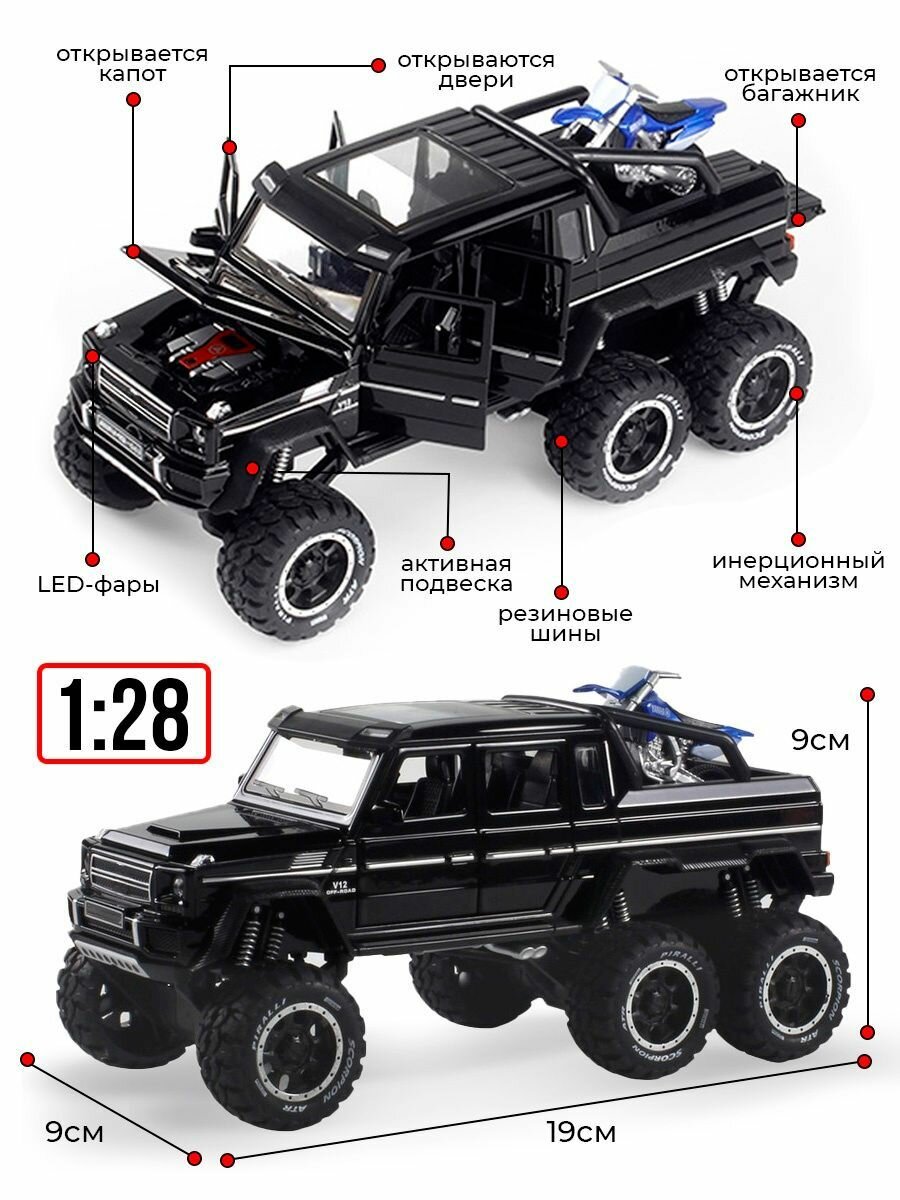Отзывы на Машинка металлическая WiMi Mercedes Benz AMG-G63 с мотоциклом, 1:28 черный, звук, свет
