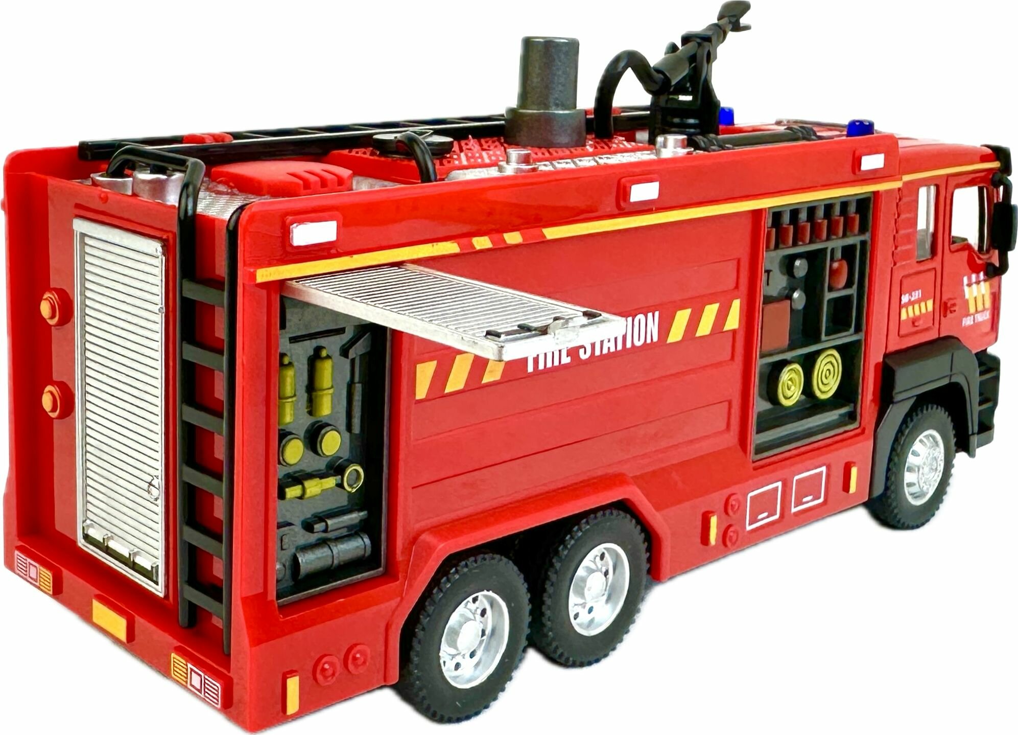 Отзывы на Инерционная пожарная машина, 1:43, откидная металлическая кабина, звук сирены, стреляет водой, фары светятся, 20х9х6 см