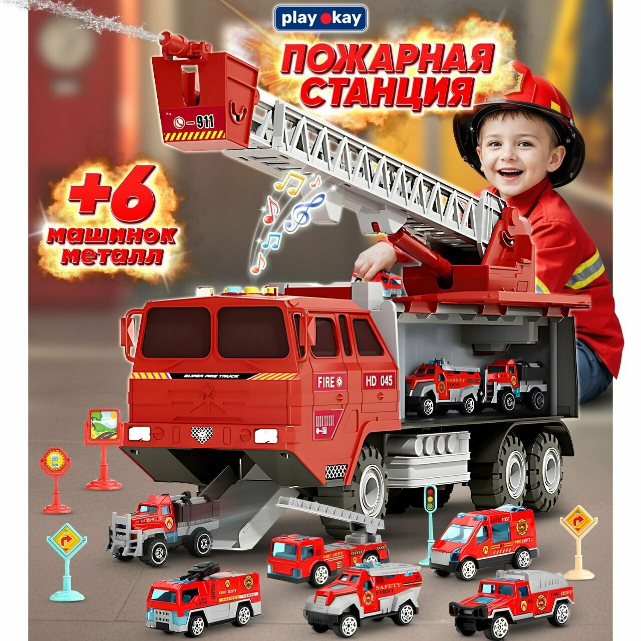 Пожарная машина игрушка Play Okay стреляет водой, инерционный механизм, станция, набор машинок в комплекте, красный информация:
