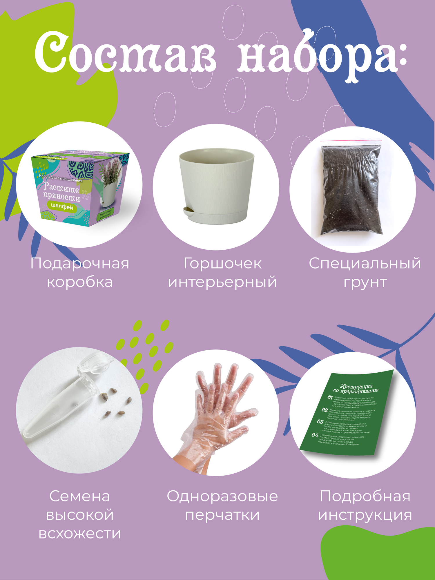 | Комплектация | Подарочная коробка, грунт для растений, интерьерный горшочек, семена, пара одноразовых перчаток, подробная инструкция по выращиванию растений. |