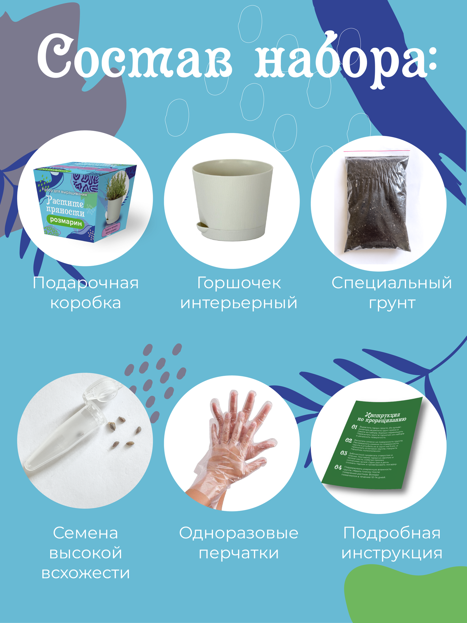 | Комплектация | Подарочная коробка, грунт для растений, интерьерный горшочек, семена, пара одноразовых перчаток, подробная инструкция по выращиванию растений. |