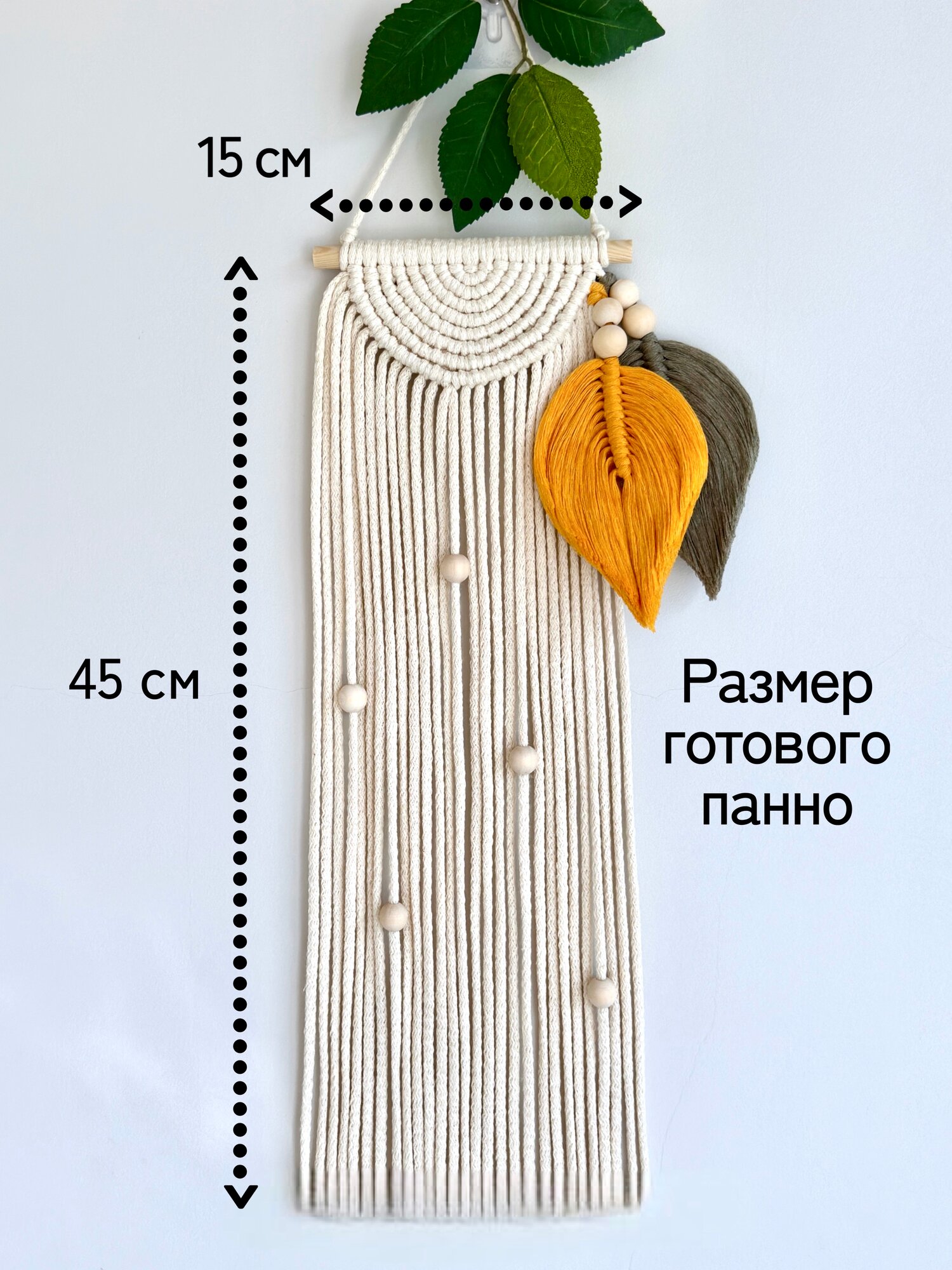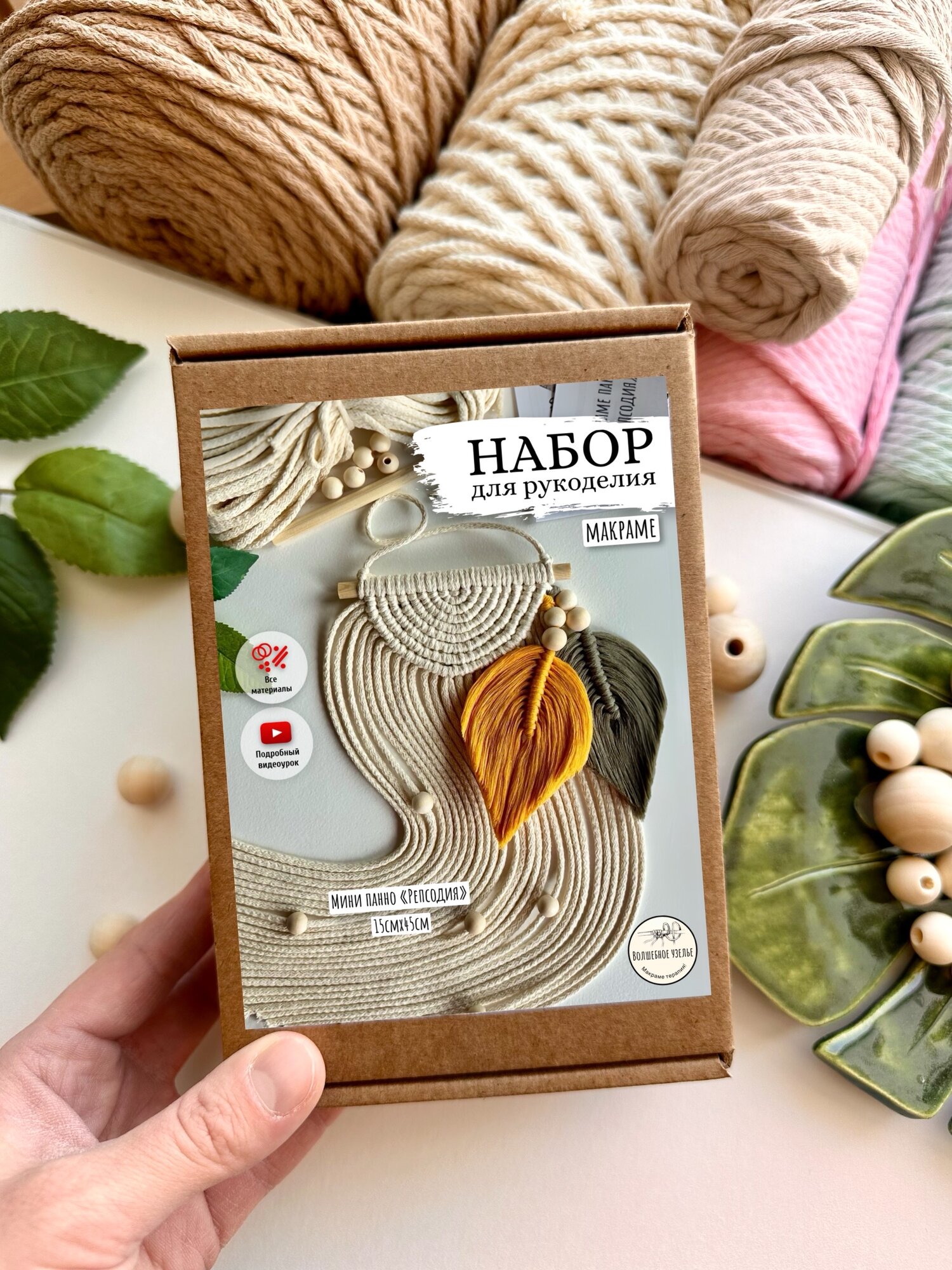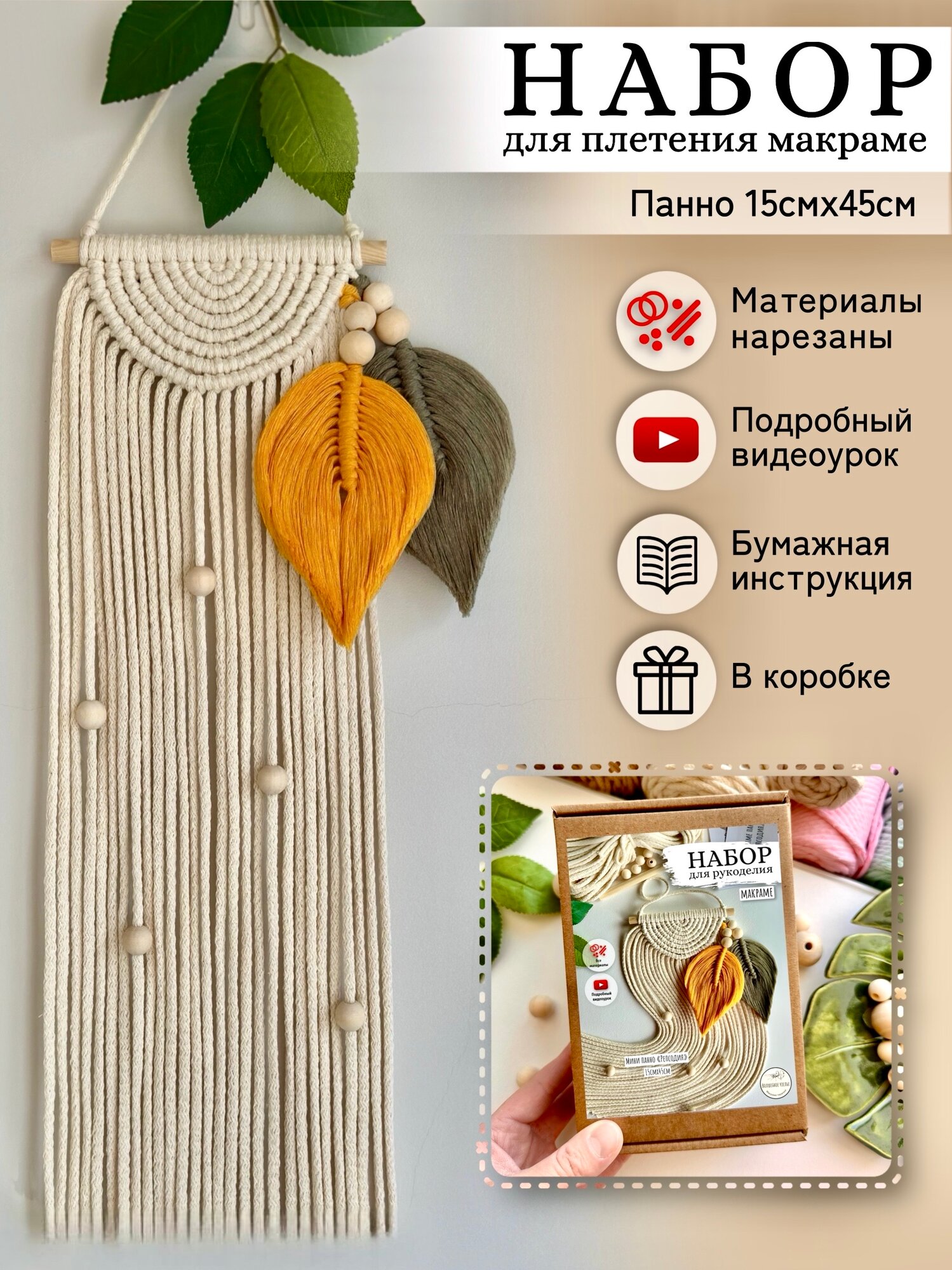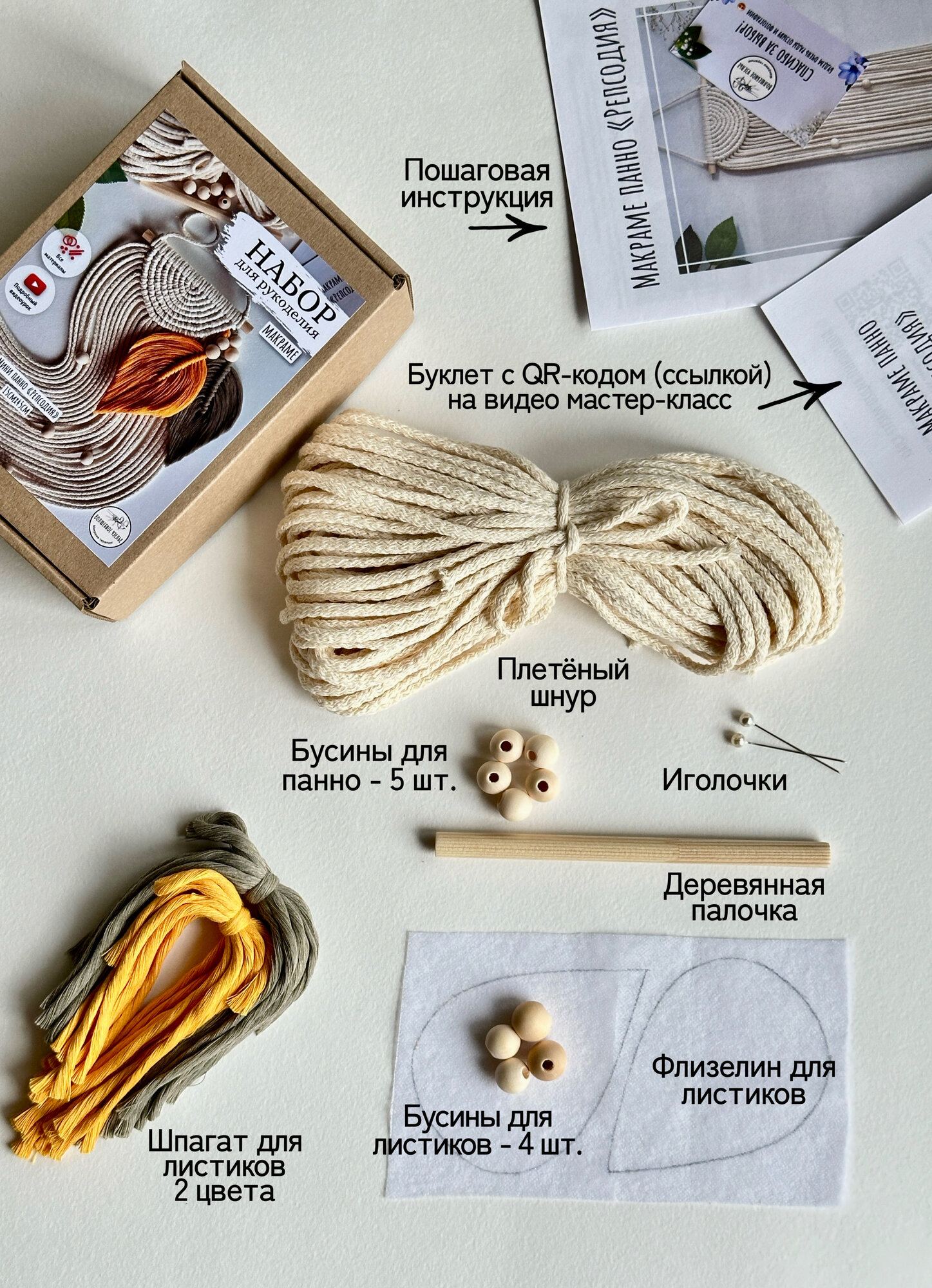 | Комплектация | плетеный хлопковый шнур (нарезан по размерам); хлопковый шпагат двух цветов (нарезан по размерам); крафт коробка; деревянные бусины - 9 шт.; деревянная палочка 1 шт.; флизелин с оттиском листиков; портновские булавки - 2 шт.; буклет с QR-кодом на подробный видео мастер класс и комплектацией; подробная бумажная инструкция - 2 стр.; открытка с благодарностью |