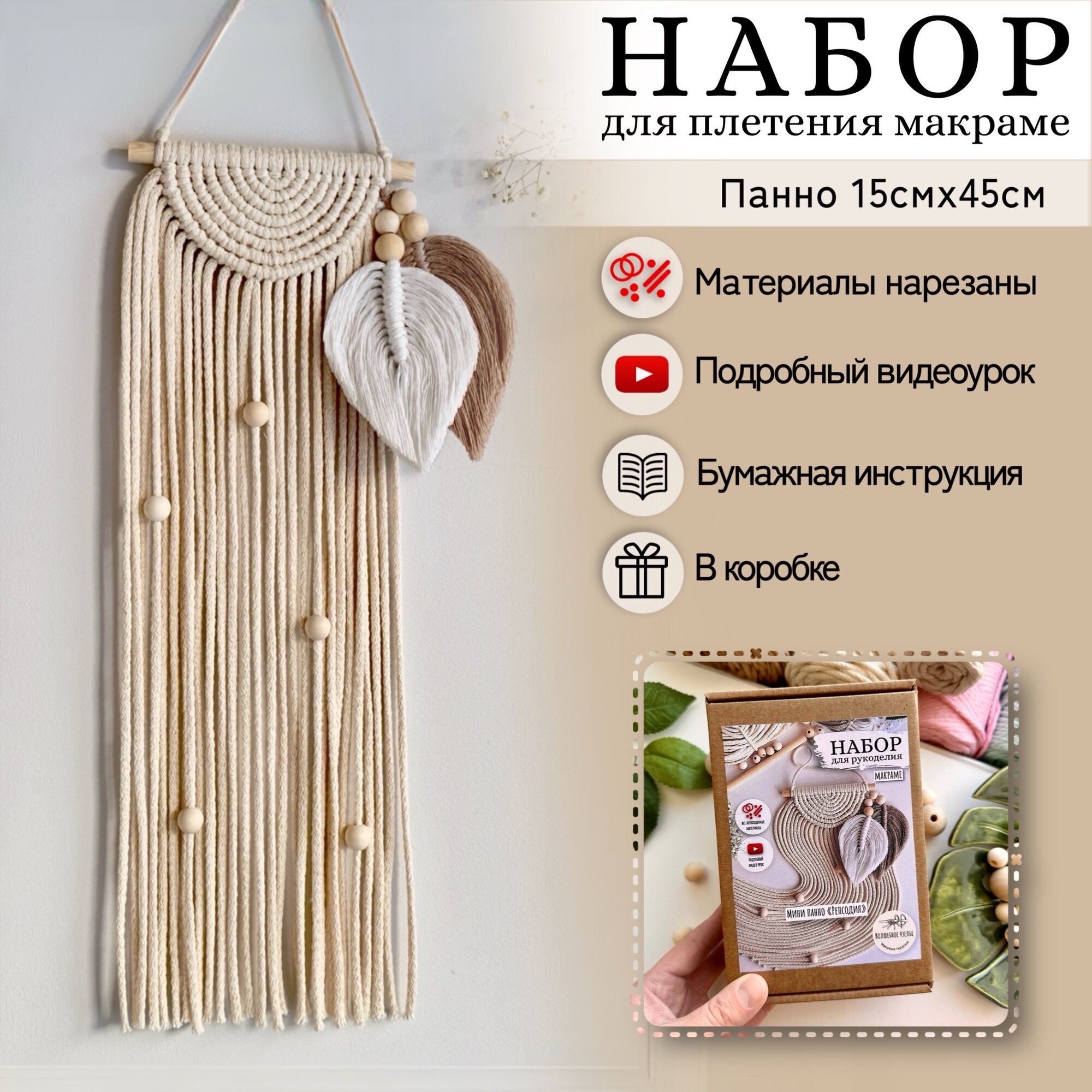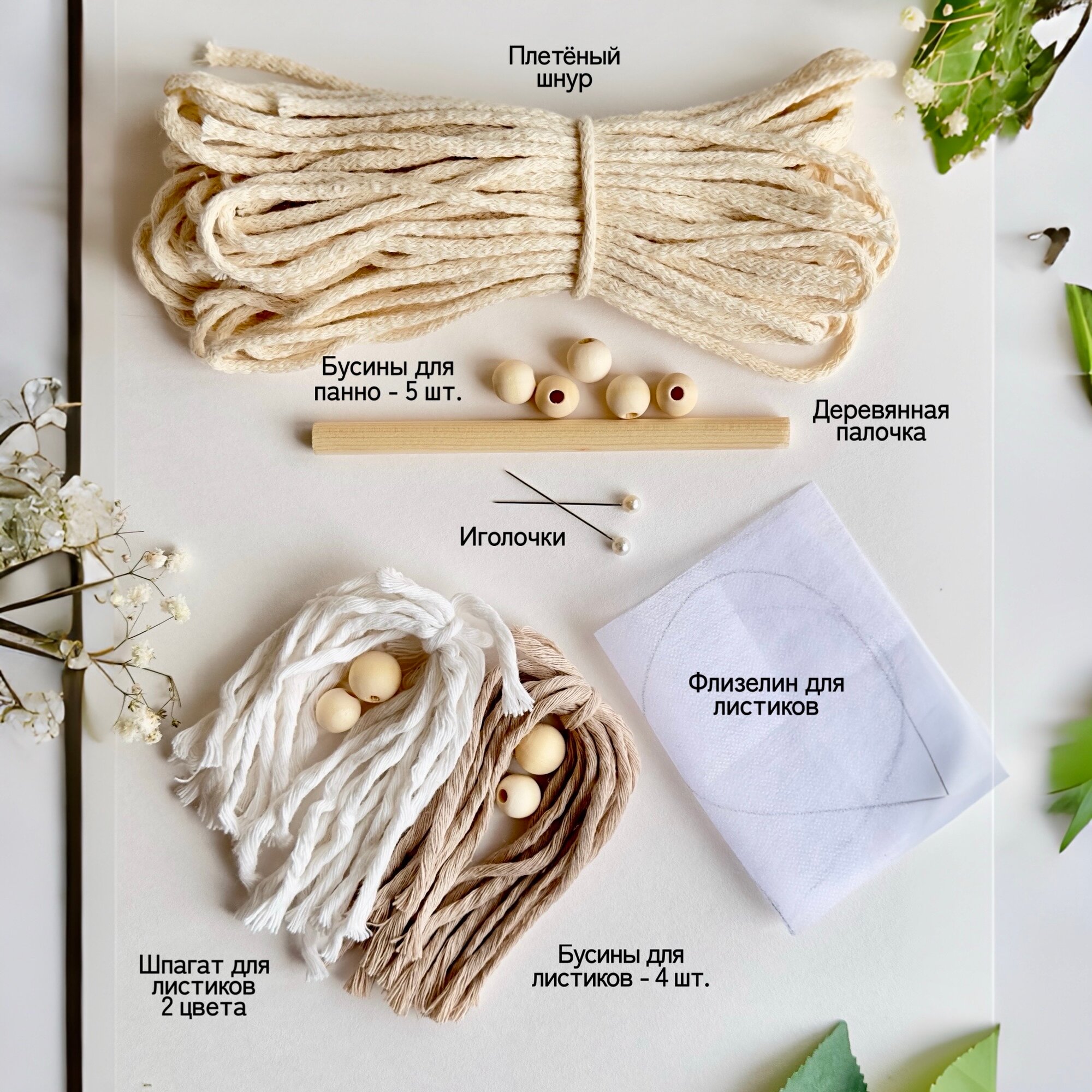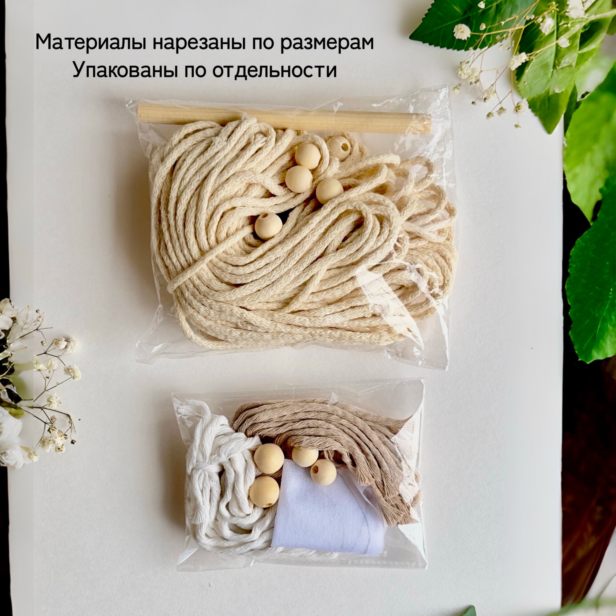 | Комплектация | плетеный хлопковый шнур (нарезан по размерам); хлопковый шпагат двух цветов (нарезан по размерам); крафт коробка; деревянные бусины - 9 шт.; деревянная палочка 1 шт.; флизелин с оттиском листиков; портновские булавки - 2 шт.; буклет с QR-кодом на подробный видео мастер класс и комплектацией; подробная бумажная инструкция - 2 стр.; открытка с благодарностью |