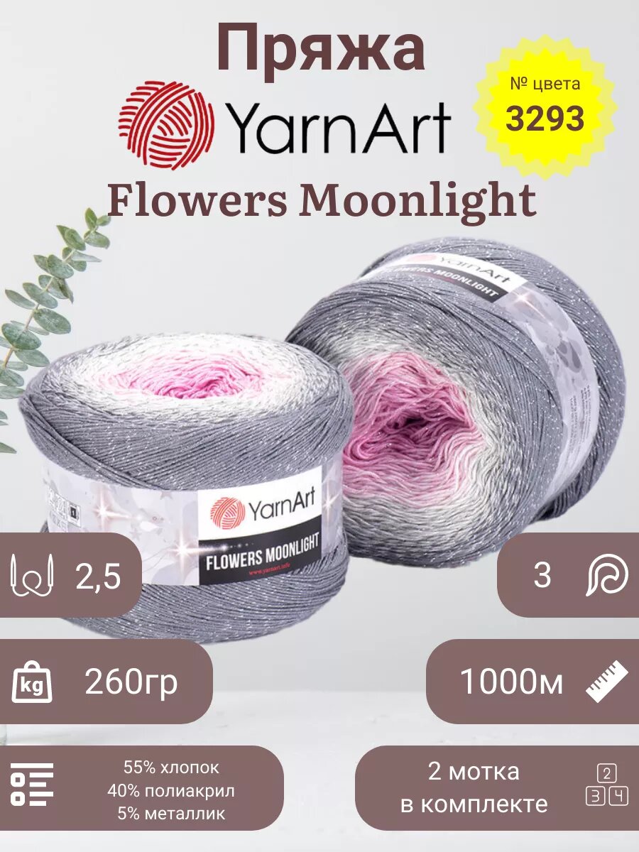 Отзывы на Пряжа YarnArt Flowers Moonlight серый-белый-розовый (3293), 53%хлопок/43%акрил/4%металлик, 1000м, 260г, 2шт
