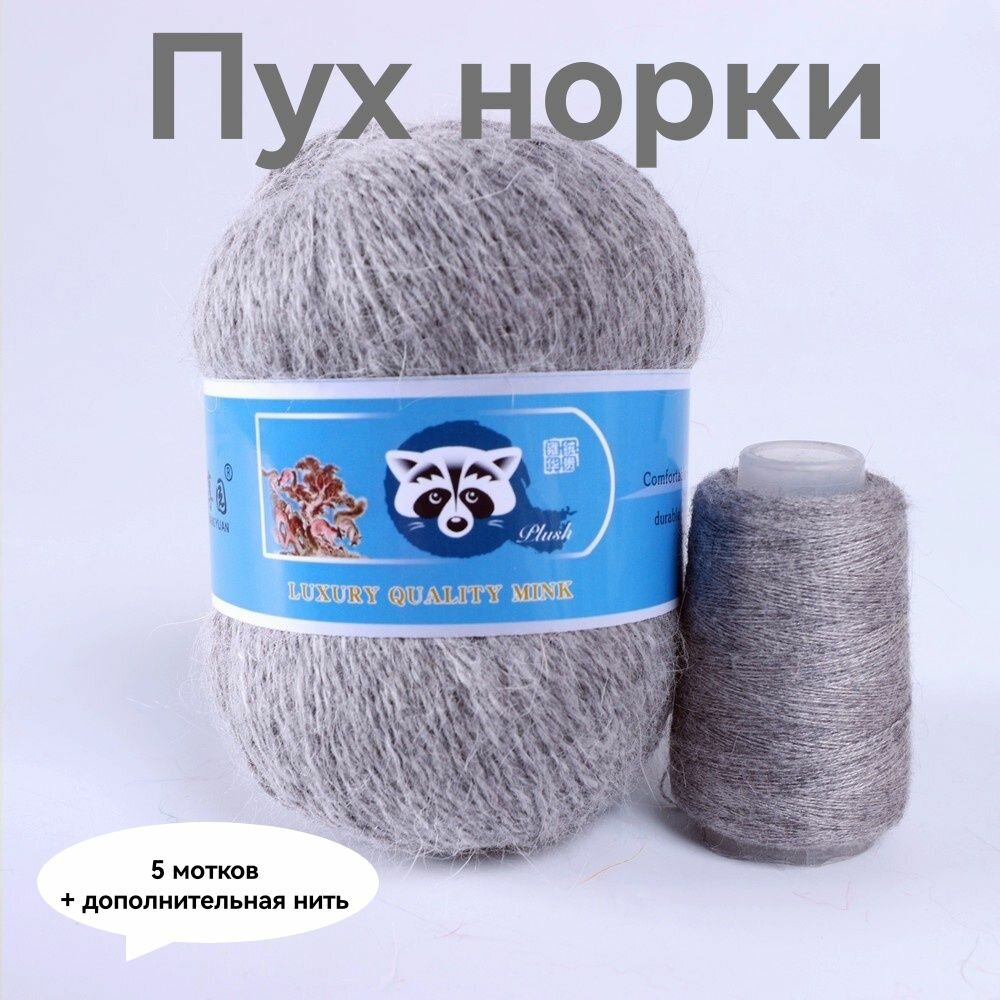 Отзывы на Пряжа Пух норки - 5 мотков 50гр/350м + 5 мотков добавочной нити, цвет 833 серый меланж , синяя этикетка