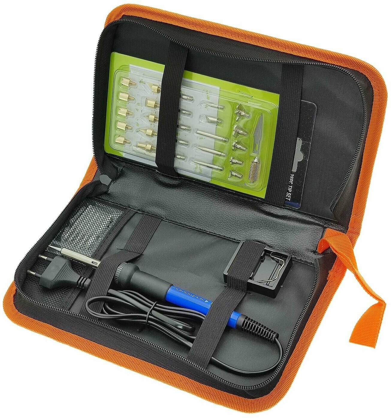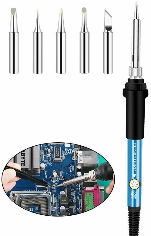 | Подробная комплектация | Паяльник с терморегулятором 60Вт, жало для паяльника 5шт, подставка для паяльника, набор с насадками 28шт + трафареты 2шт, сумка-чехол |