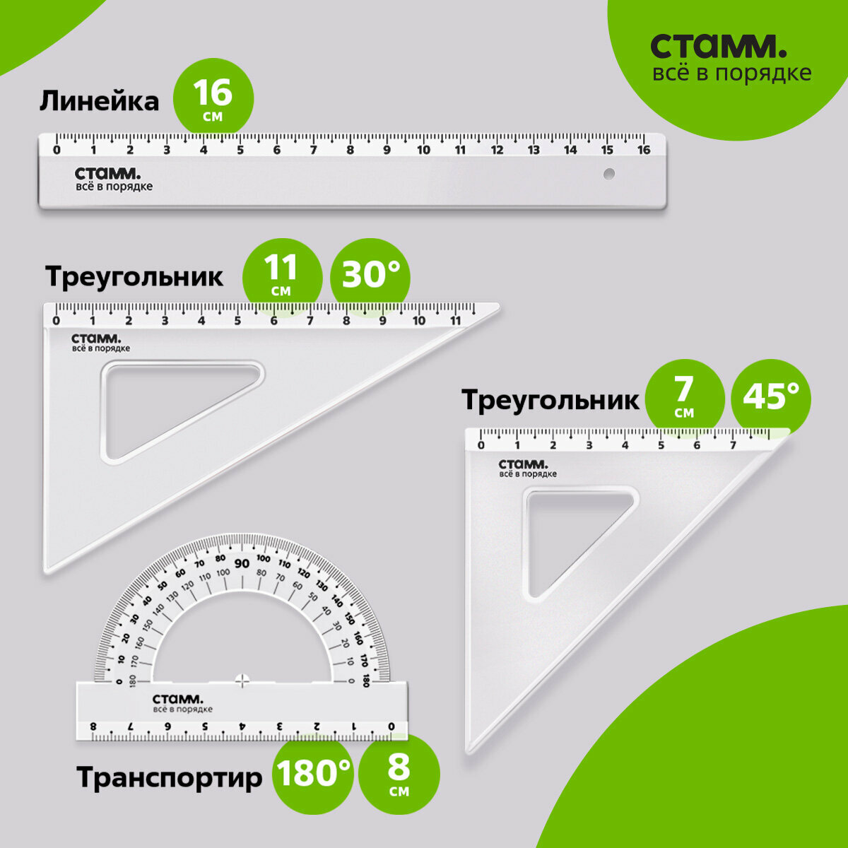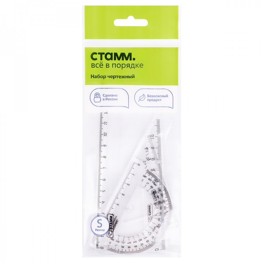 Набор чертежный Стамм, размер S (линейка 16см, 2 треугольника, транспортир), прозрачный (НЧ-30524)