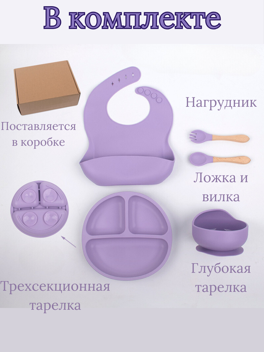 | Комплектация | Нагрудник-слюнявчик, секционная тарелка, тарелка на присоске, ложка, вилка |