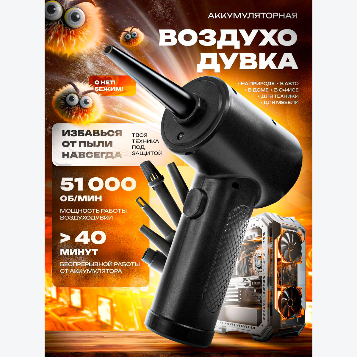 Сверхмощная воздуходувка для компьютера/электроники. Аккумуляторная, 51000об./мин, 68Вт