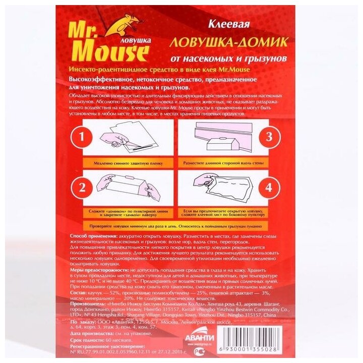 От грызунов и насекомых ловушка клеевая домик 2шт/уп, цена за уп. (15гр.) Mr.Mouse, арт.М-268 информация: