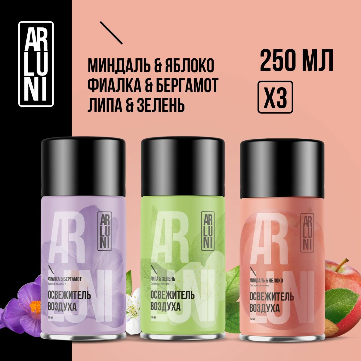 Набор из 3шт сменных баллонов освежителей воздуха фиалка бергамот, липа зелень, миндаль яблоко информация: