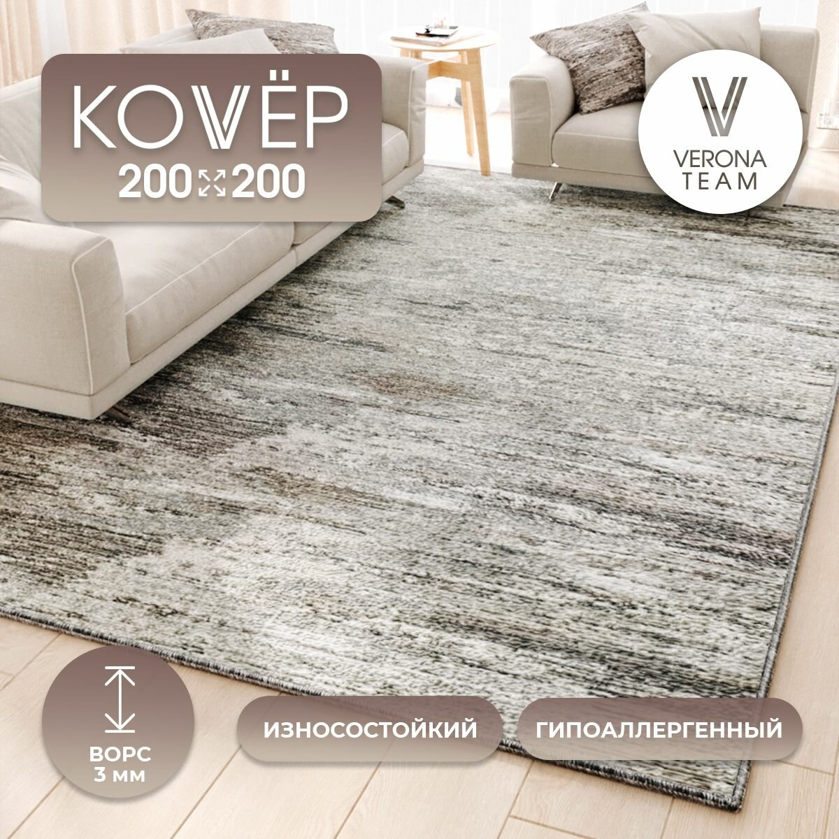Ковер для комнаты, Палас в прихожую спальню на пол кухни VERONA TEAM 2х2 м 2 800 ₽