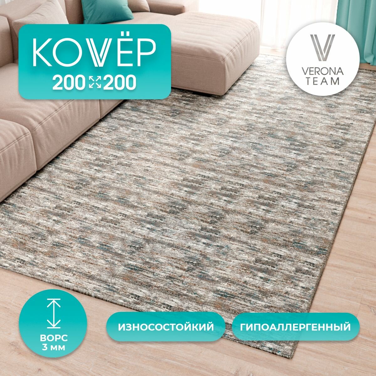 Ковер для комнаты, Палас в прихожую спальню на пол кухни VERONA TEAM 2х2 м 2 800 ₽