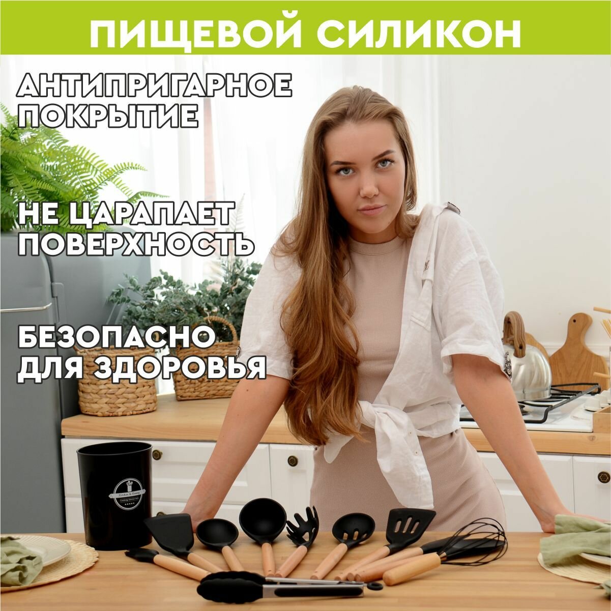 | Комплектация | В набор входят: две лопатки, одна их них с перфорацией, две ложки для помешивания, шумовка, половник, ложка для спагетти, пресс для картофеля, кондитерская кисть, венчик и щипцы. А так же удобная подставка. |