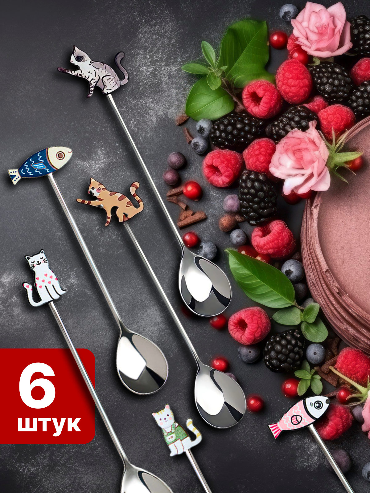 Ложка чайная, 6 штук, подарочный набор ложек с котиками и рыбками, набор столовых приборов информация: