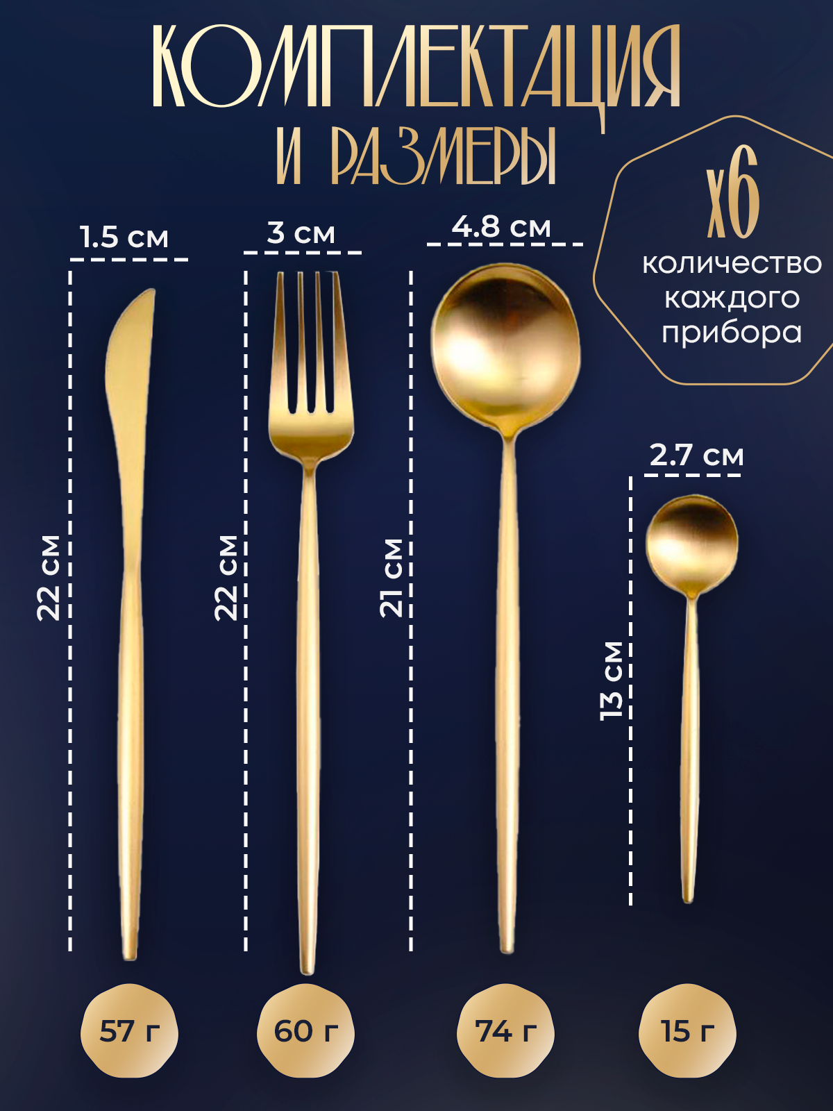 | В набор входит | 6 ложек столовых, 6 вилок столовых, 6 ножей столовых, 6 ложек чайных/коейных |