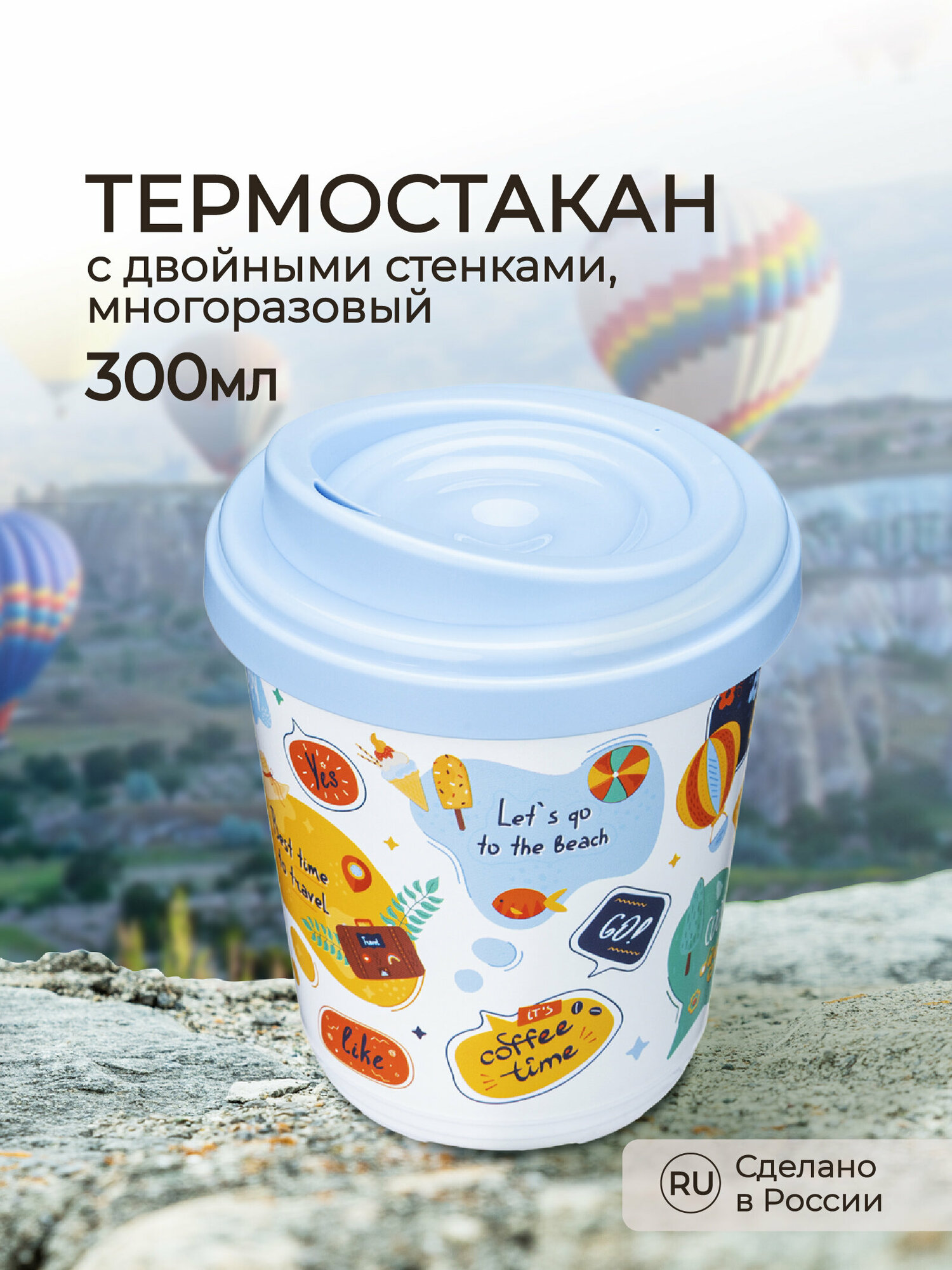Термостакан для напитков, кофе, чая с декором "Стикеры", 300 мл, голубой 355 ₽