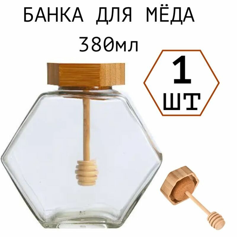 10 цен на Стеклянная банка 380мл для меда и варенья. Банка с крышкой в комплекте деревянная ложка веретено