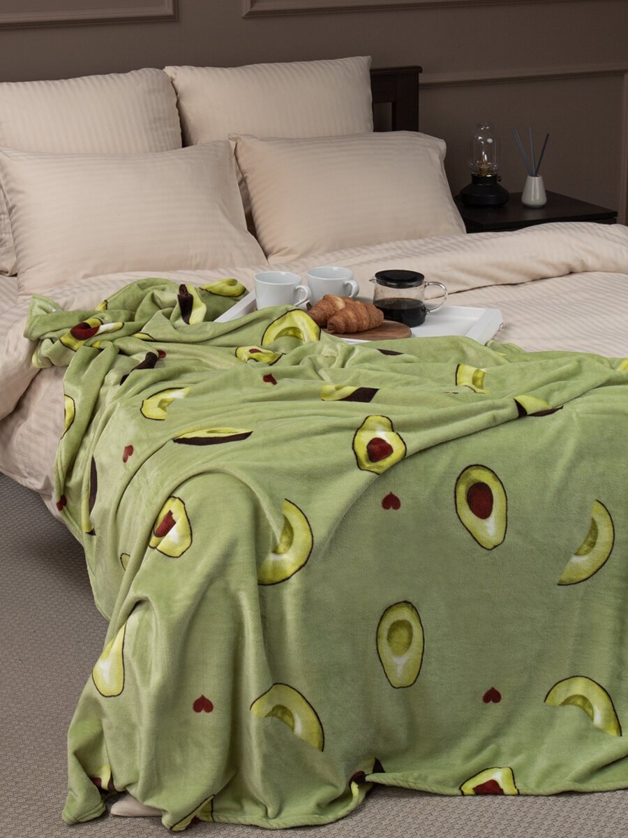 Плед TexRepublic Absolute 140х200 см, 1,5 спальный, фланелевый, покрывало на диван, теплый, мягкий, зеленый с принтом авокадо