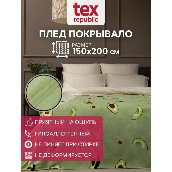 Плед TexRepublic Absolute 180х200 см, 2 спальный, велсофт, покрывало на диван, теплый, мягкий, зеленый с рисунком Авокадо