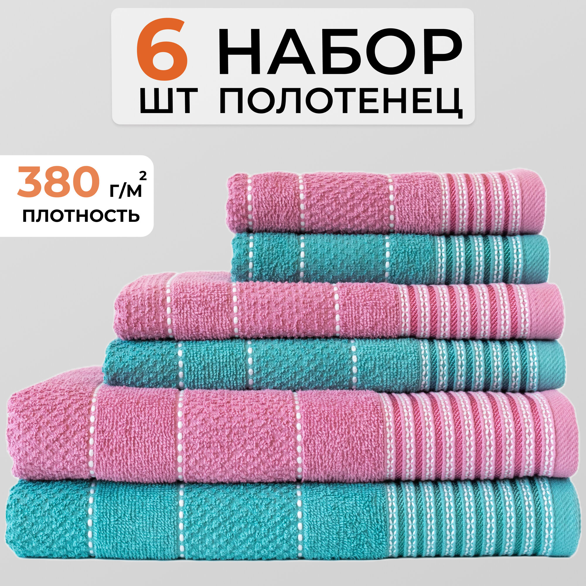 Полотенце банное KADRIYA HOME, Хлопок, 30x50, 50x80, 70x130 см, Розовый, Бирюзовый, 6 шт информация: